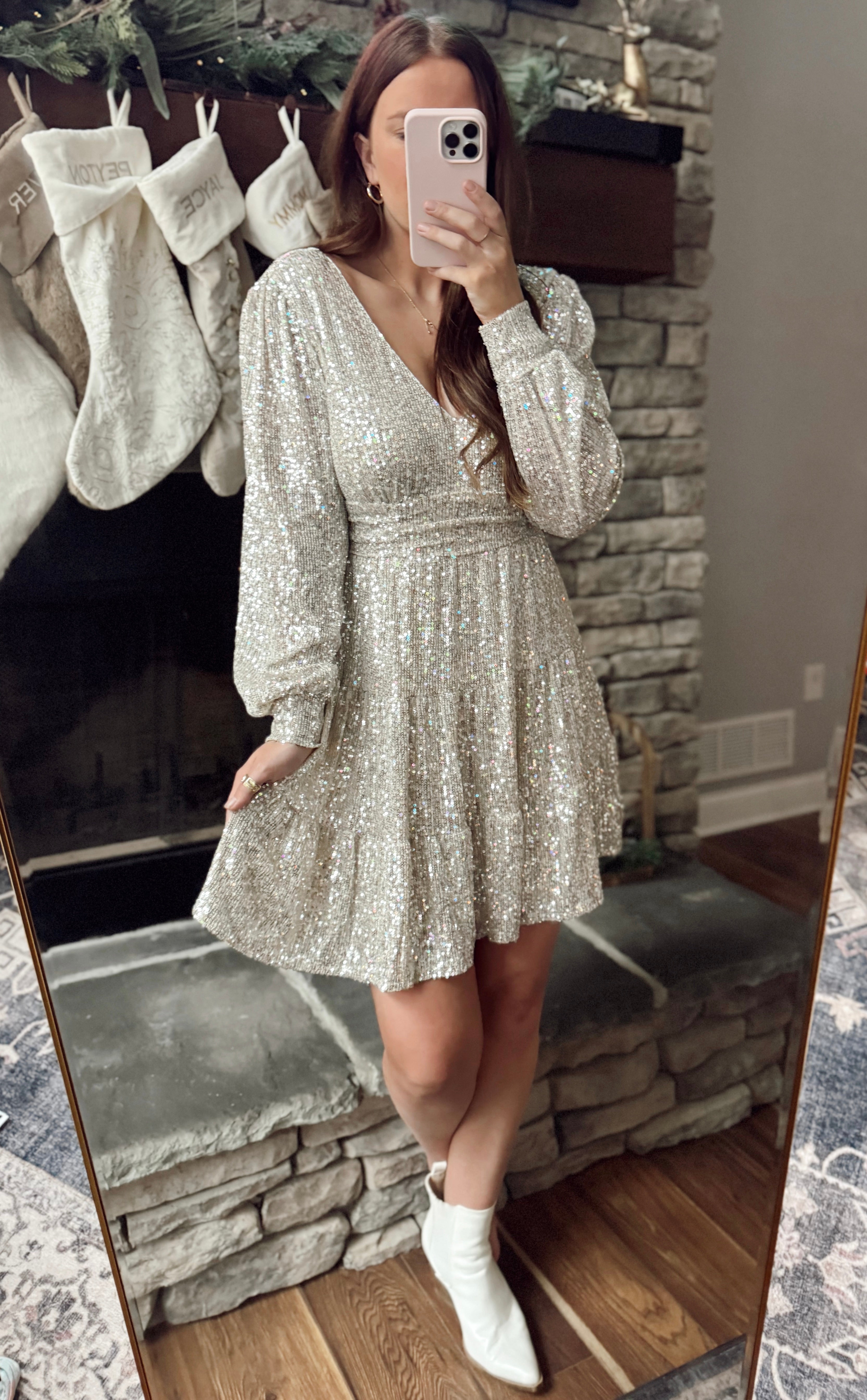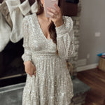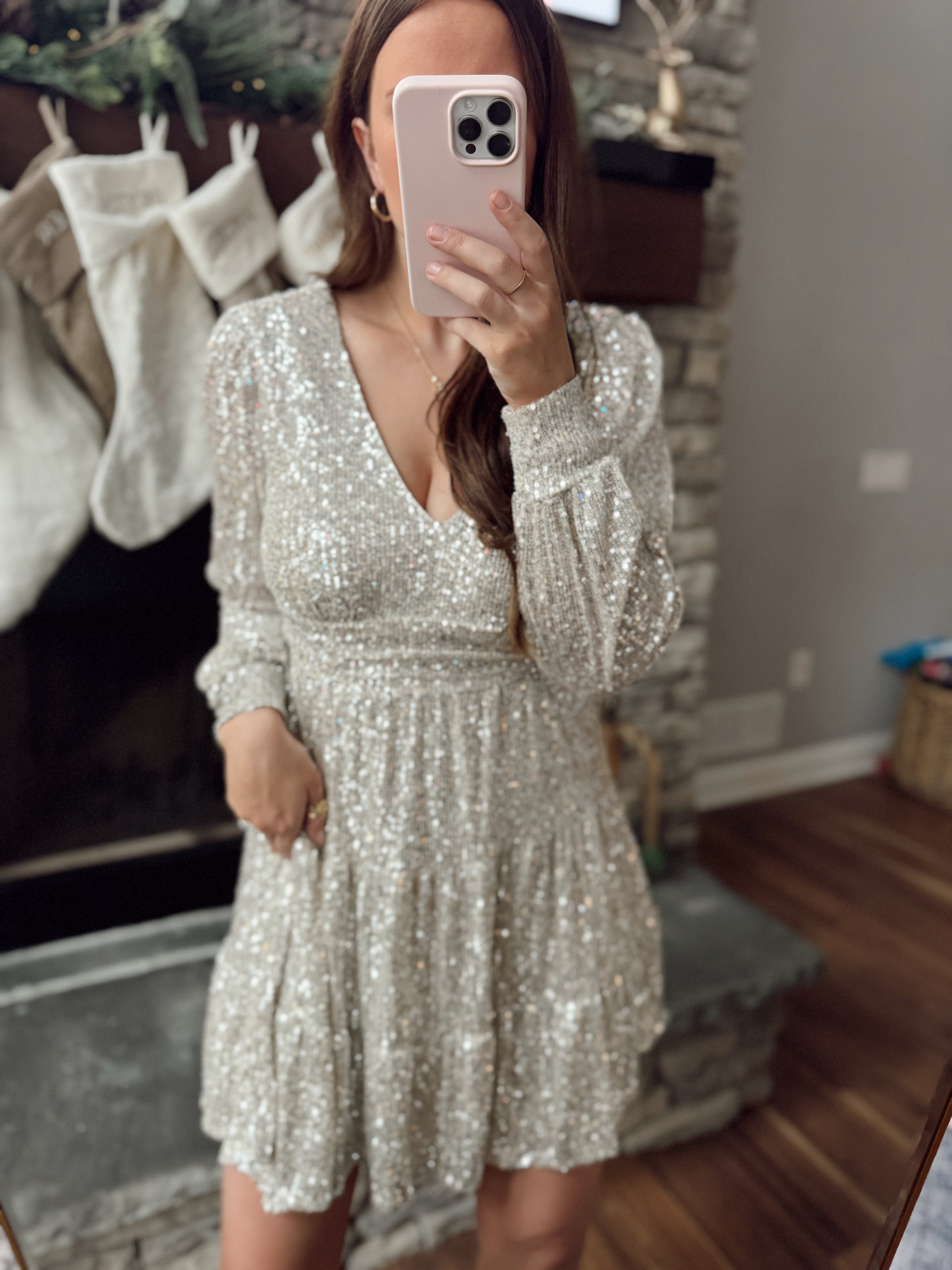 Meet at Midnight Champagne Sequins Long Sleeve Tiered Mini