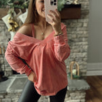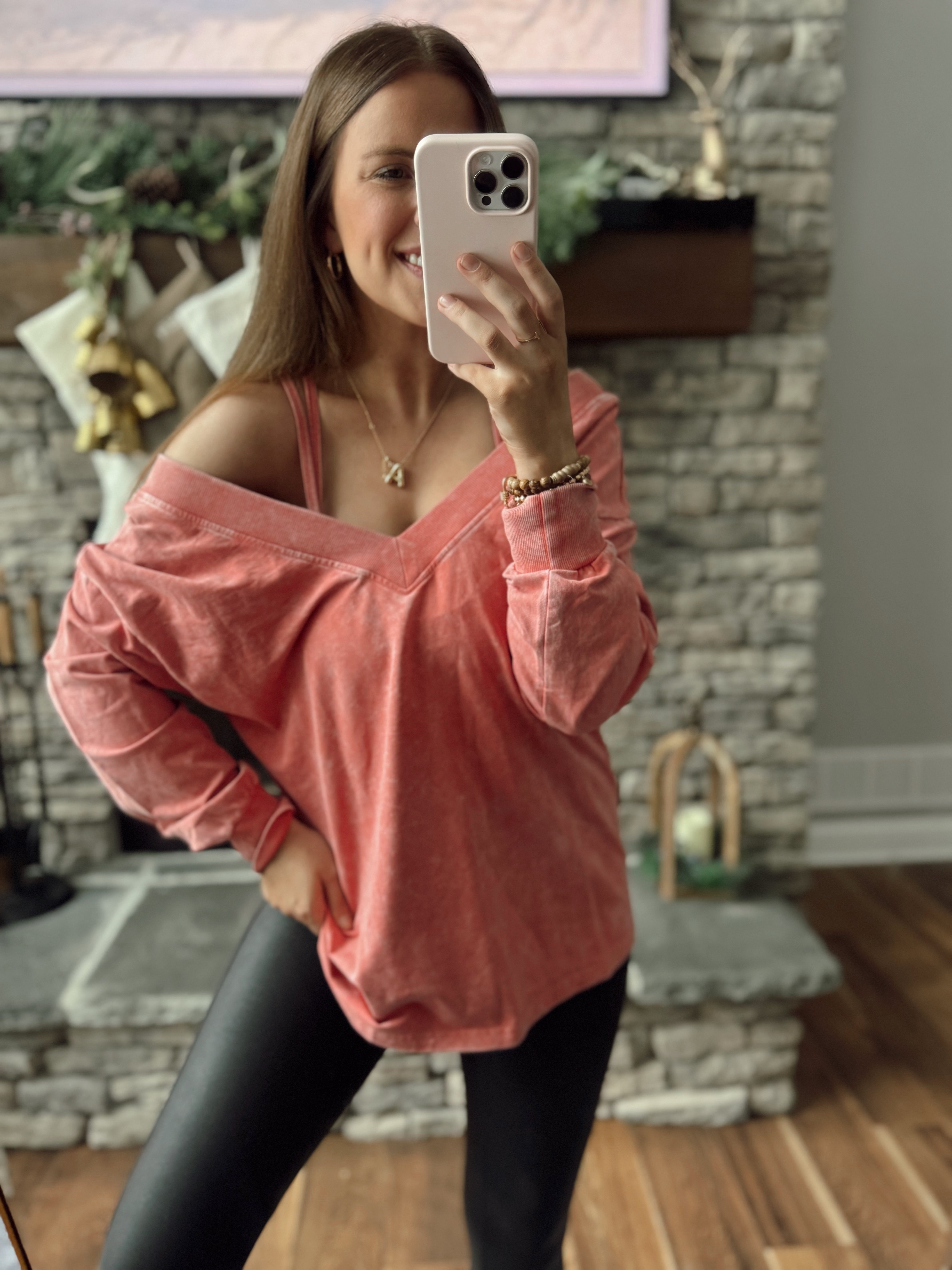 Mineral Washed Pink Cotton Deep V Long Sleeve