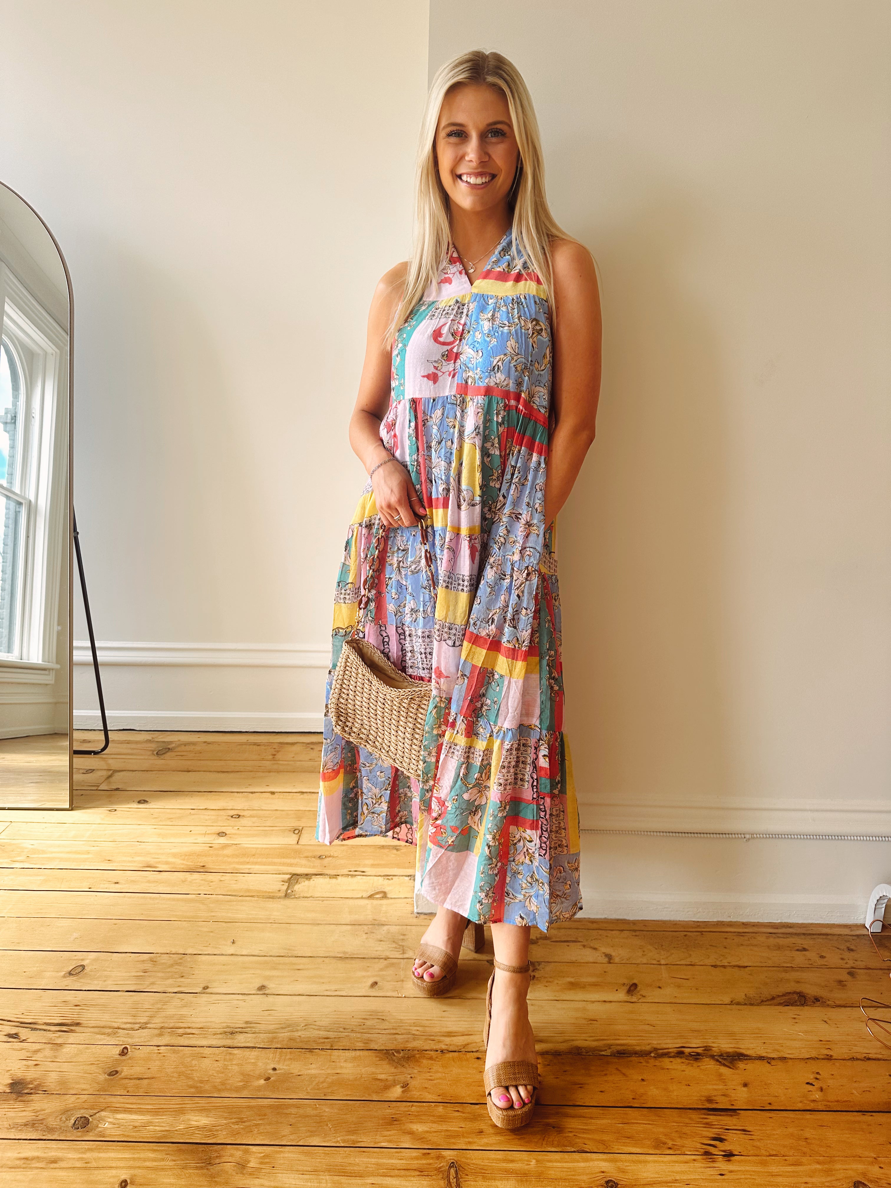 This dress is giving vacay bunch vibes! Halter neckline - lined & has pockets! Relaxed fit. VERY cute!