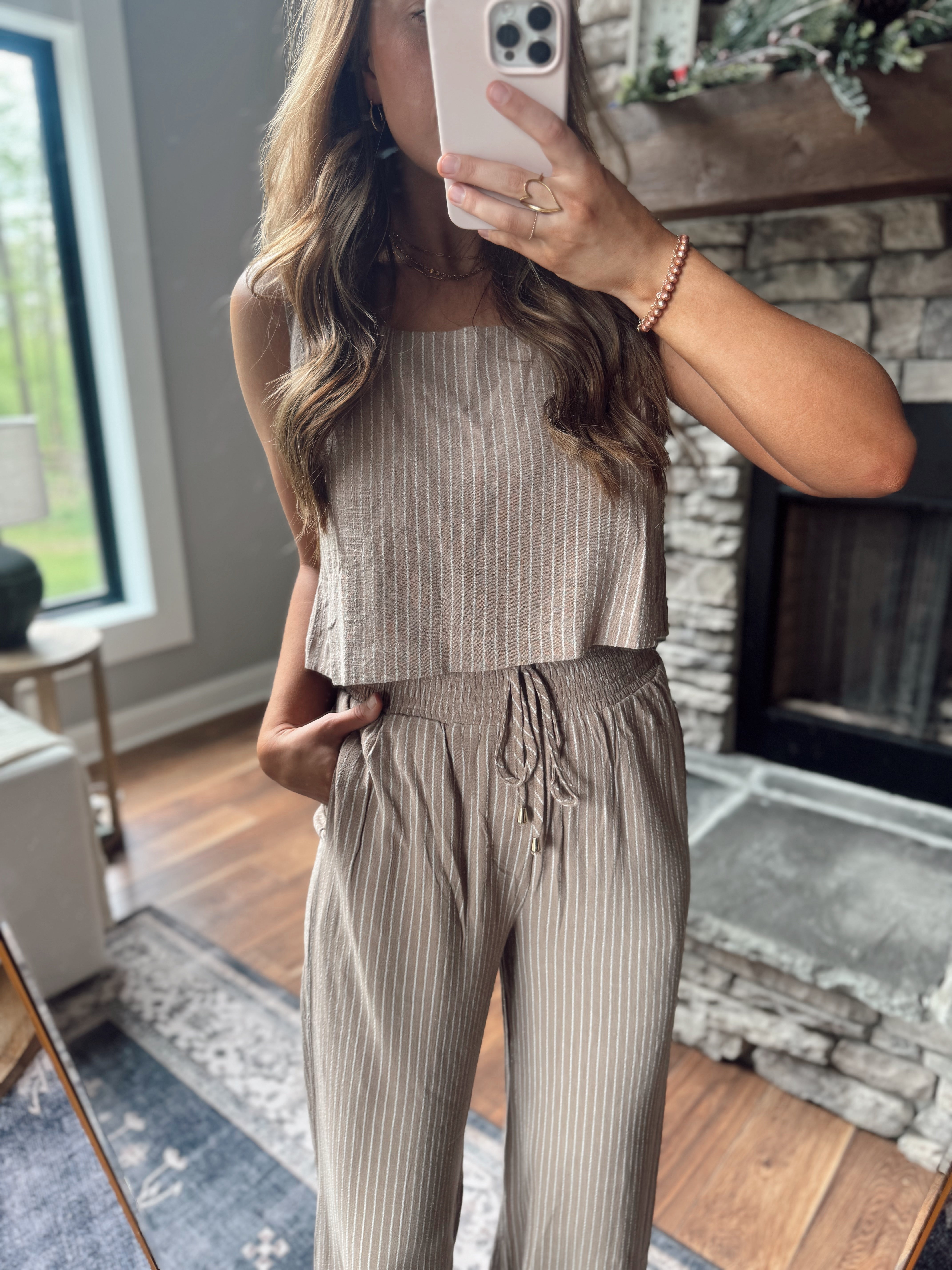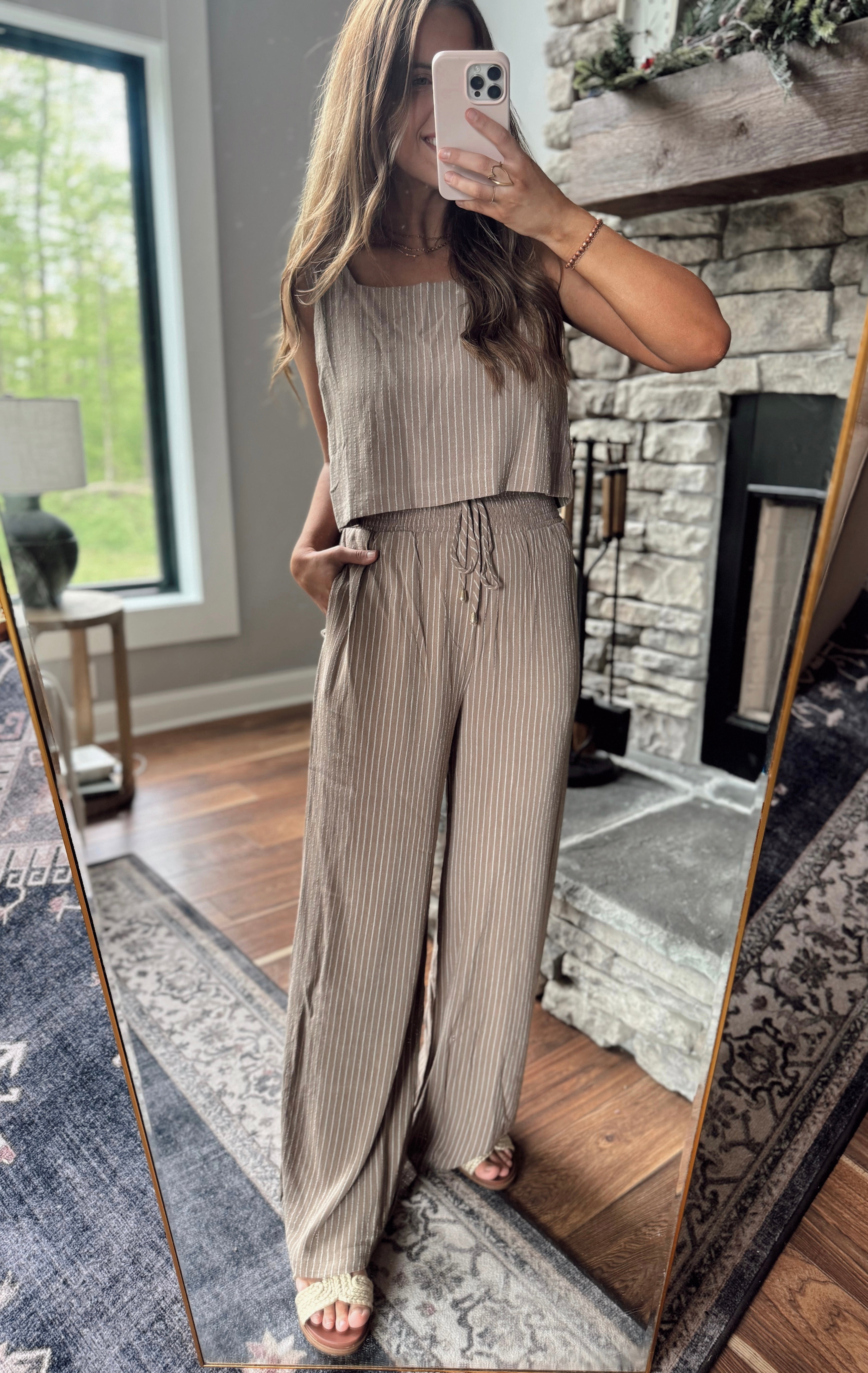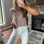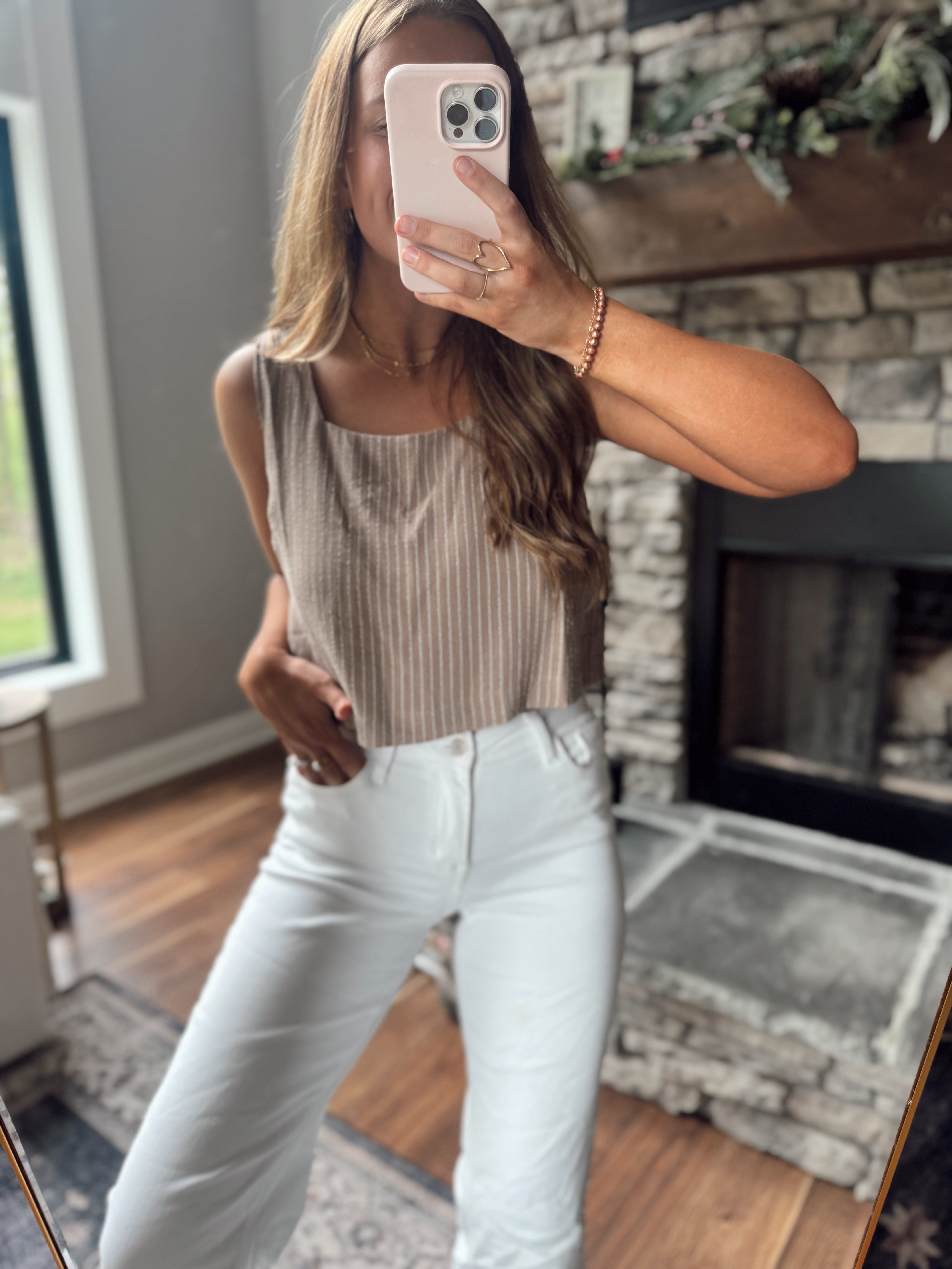 A more crop fit! Super cute. True fit. Matches pants BUT you can wear them with just any denim. My Time Fawn White Linen Square Neck Tank