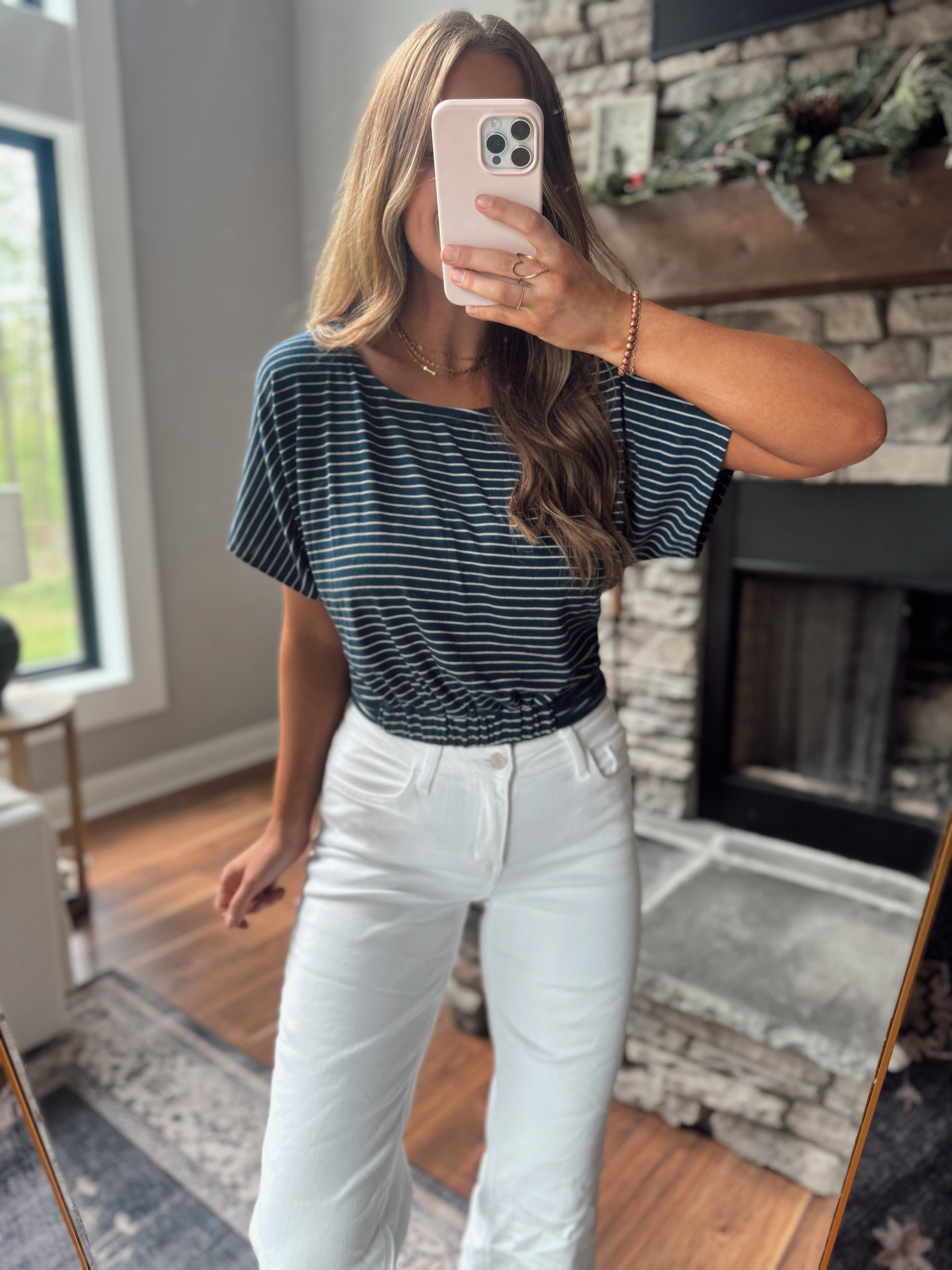Navy Ruched Hem Ribbed Striped Short Sleeve