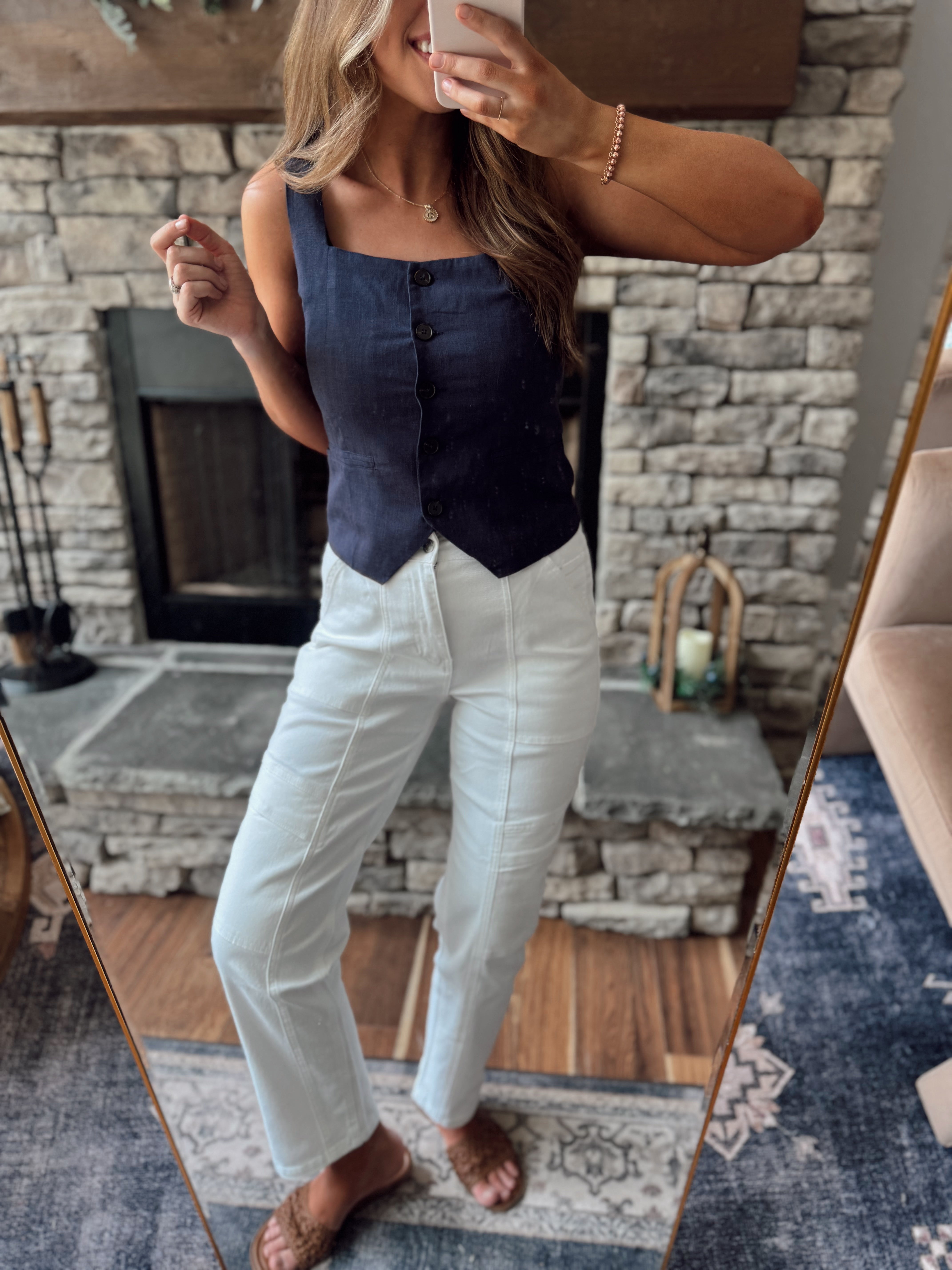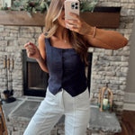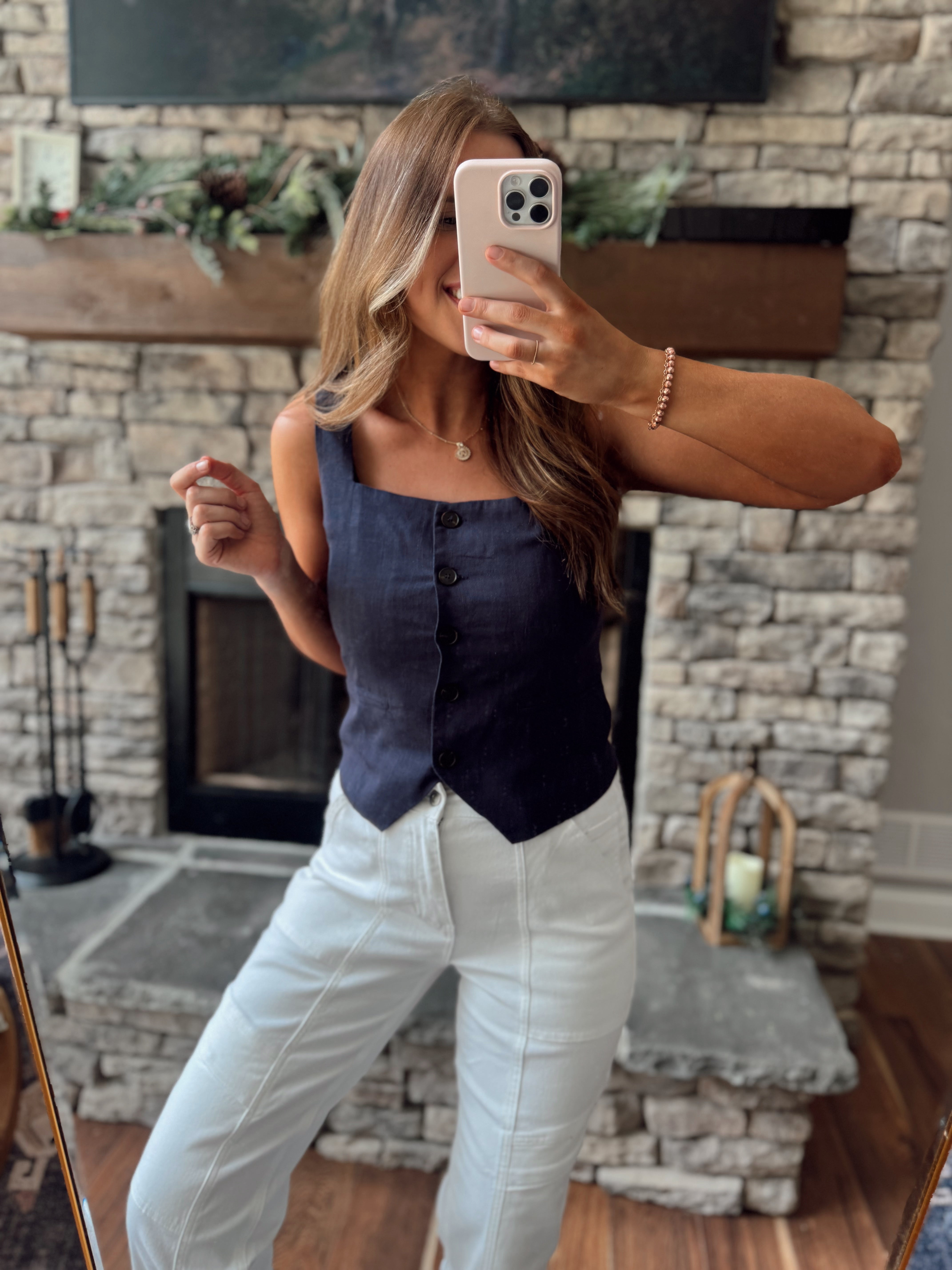 Navy Trendy Babe Linen Square Neck Button Down Sleeveless Top