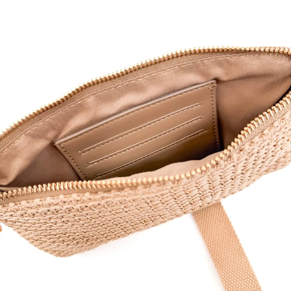 This must have raffia accessory can be styled as a clutch, a wristlet, or used as a wallet inside your favorite bag.