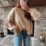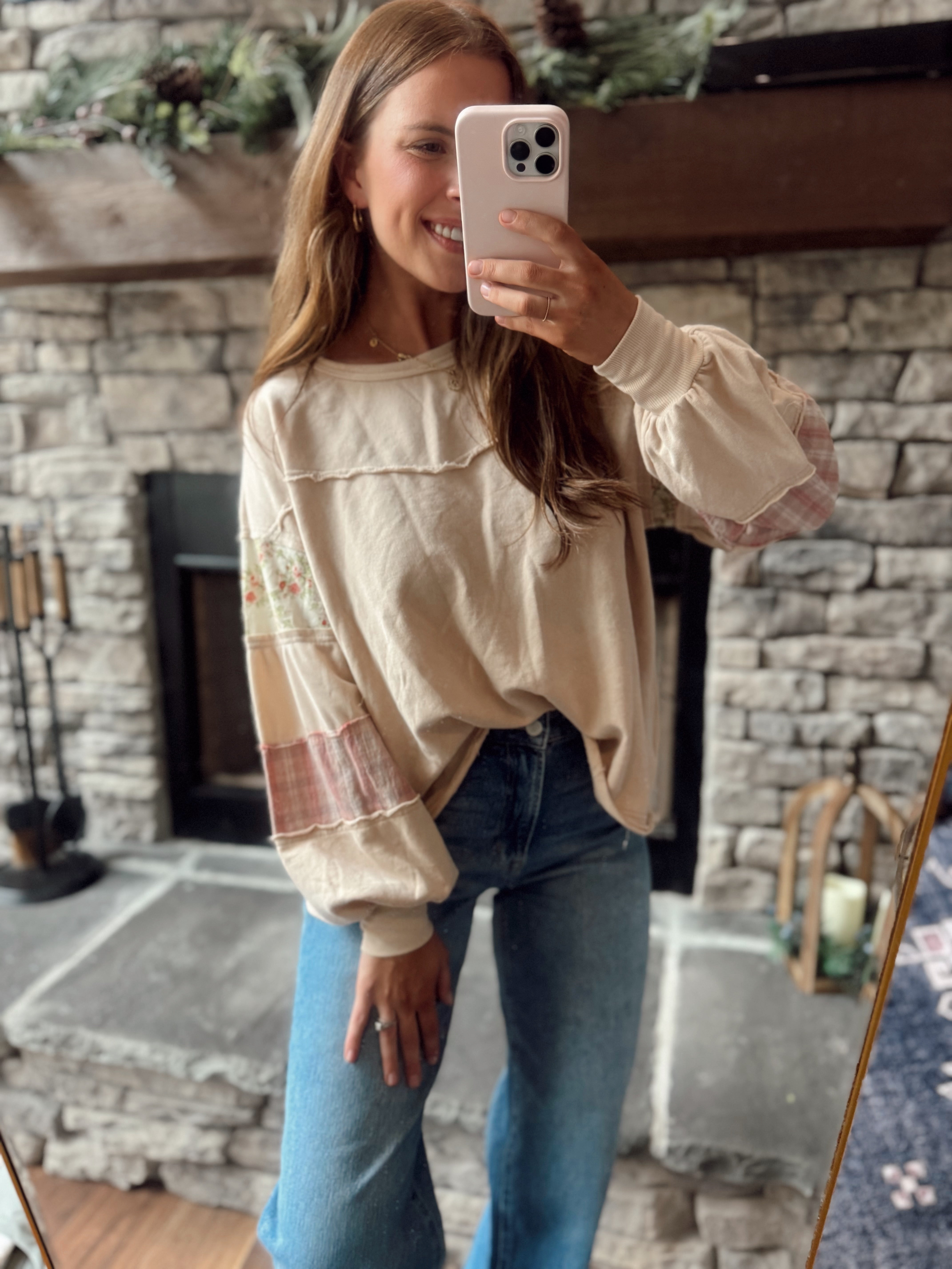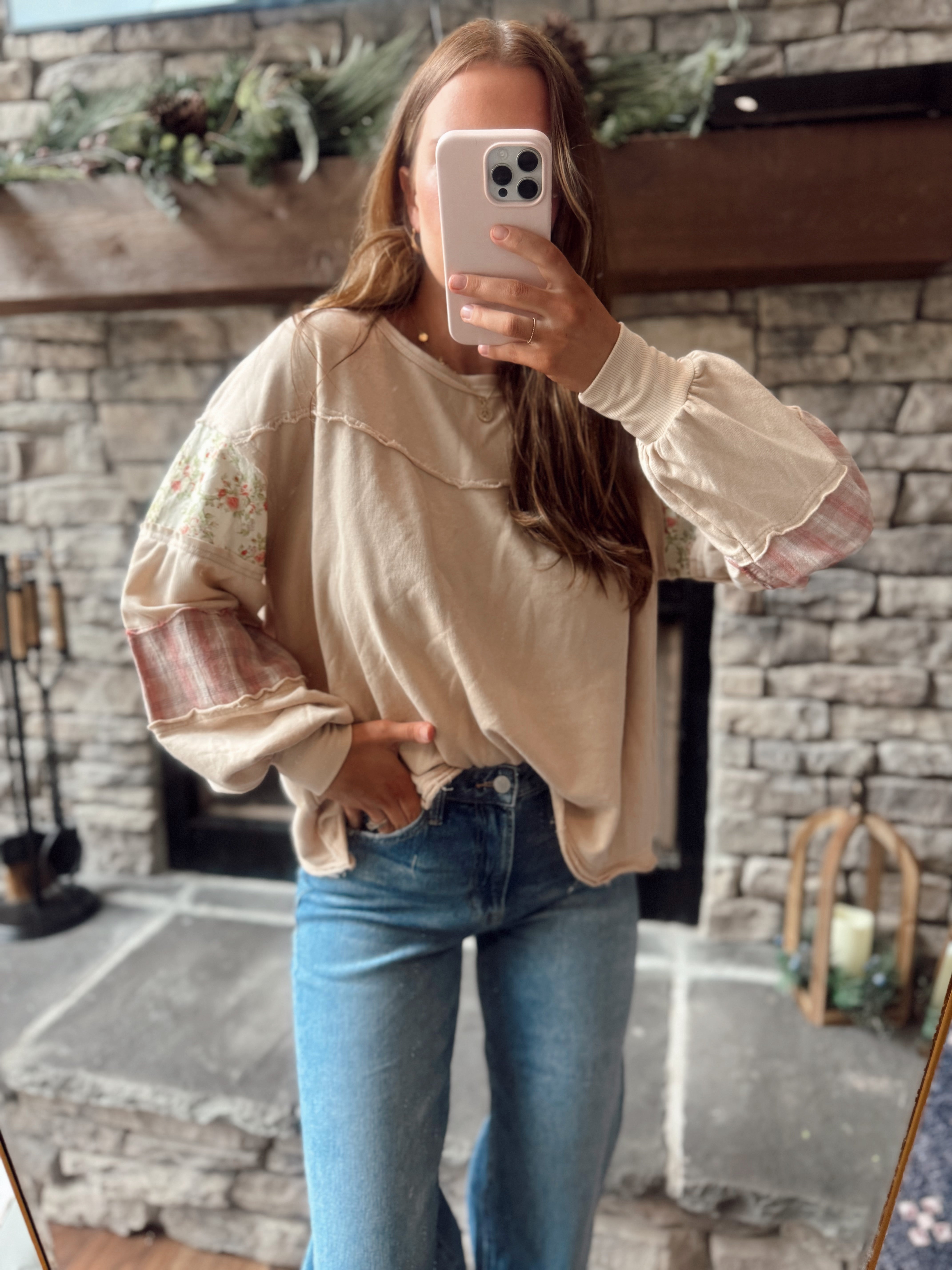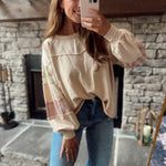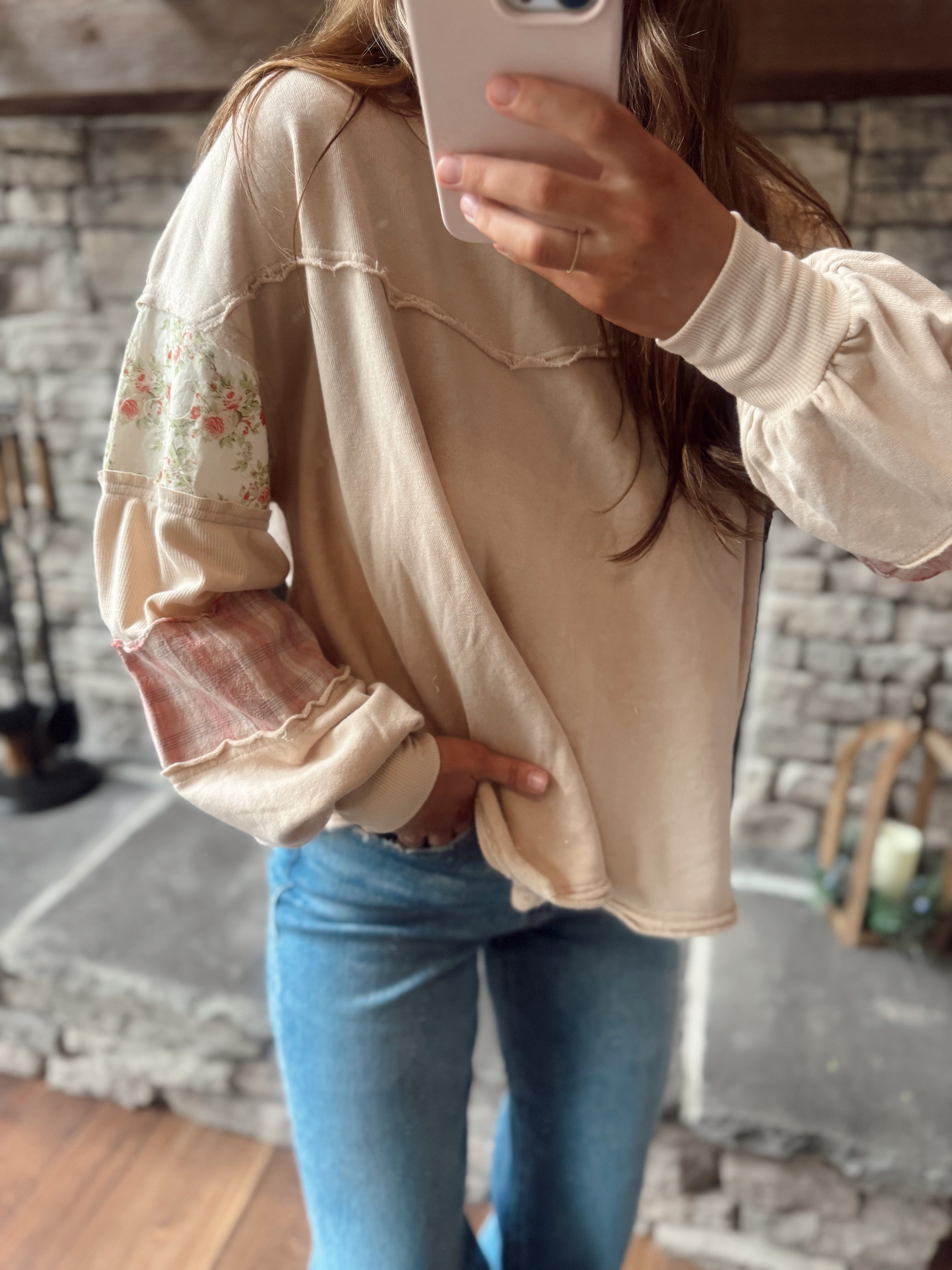 Oat Floral & Plaid Patch Work Sleeve French Terry Pullover