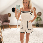 The most adorable tie shoulder romper - wide adjustable self tie straps - fitted waist - smocked back with hidden zipper! A relaxed true fit
