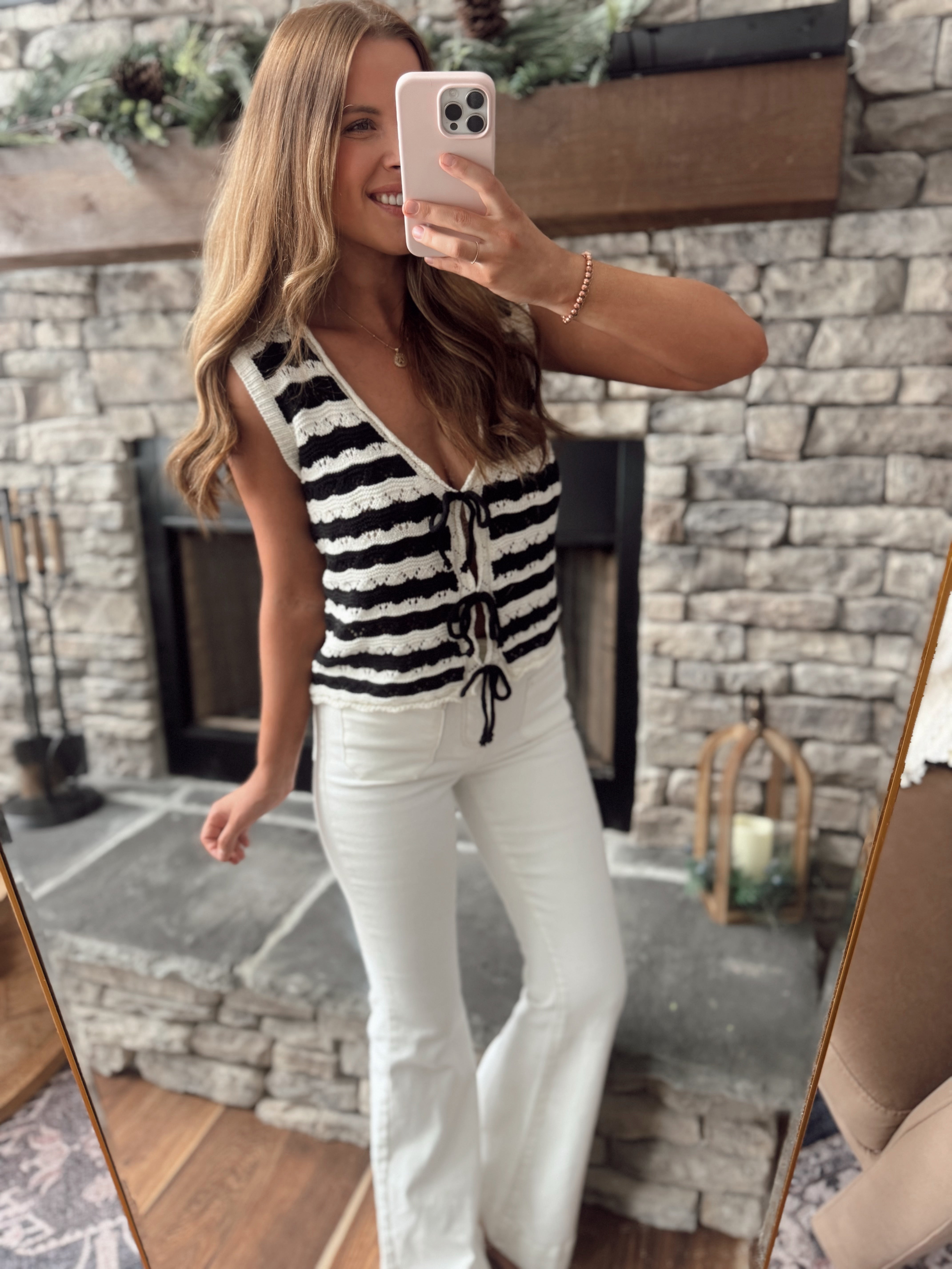 Off White/Black Scalloped Edge Front Tie Striped Vest