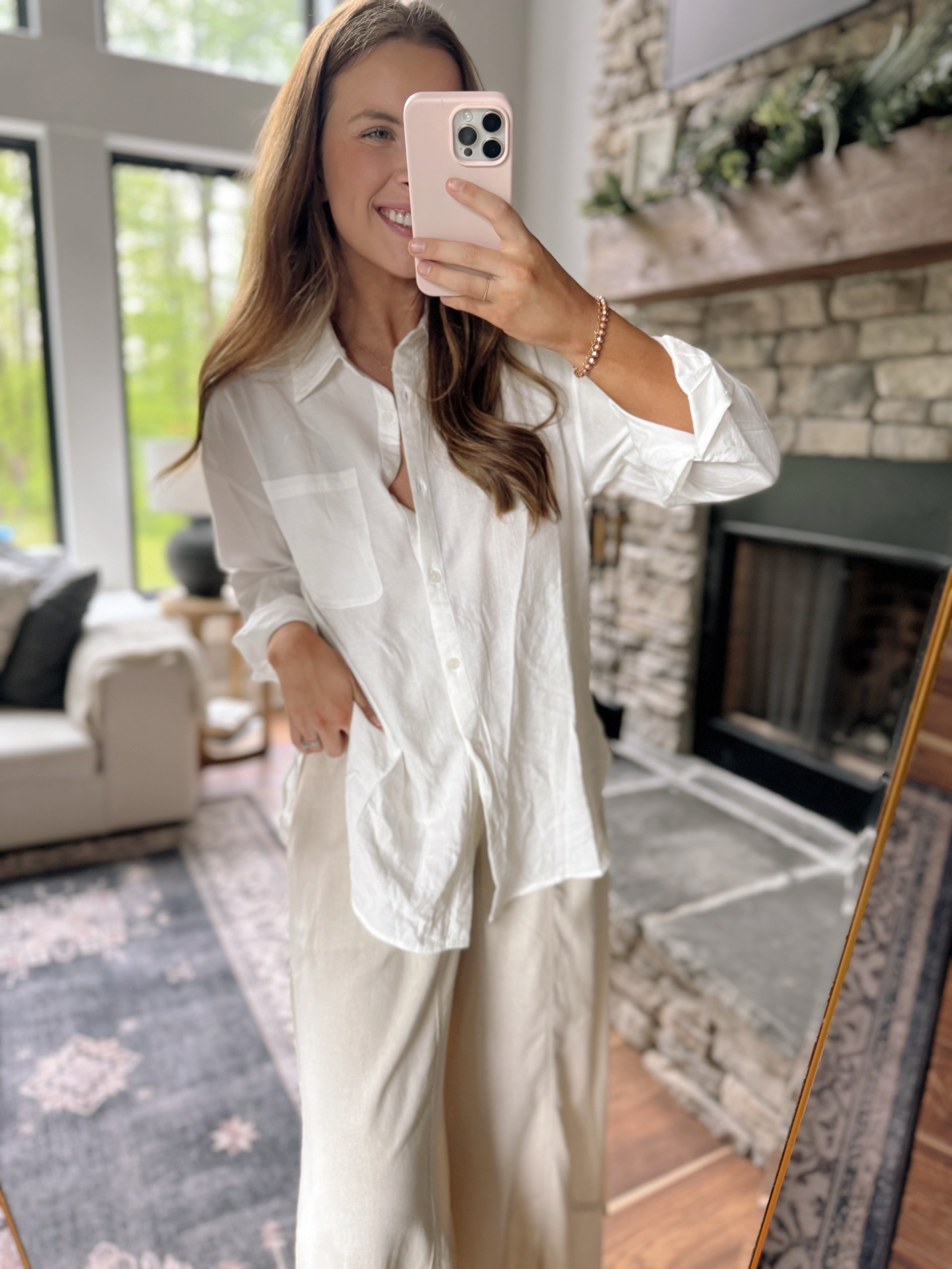 I’m obsessed with this button up! Relaxed fit - a bit more oversized! Can size down. Peep the back! Cute bows up the back.