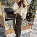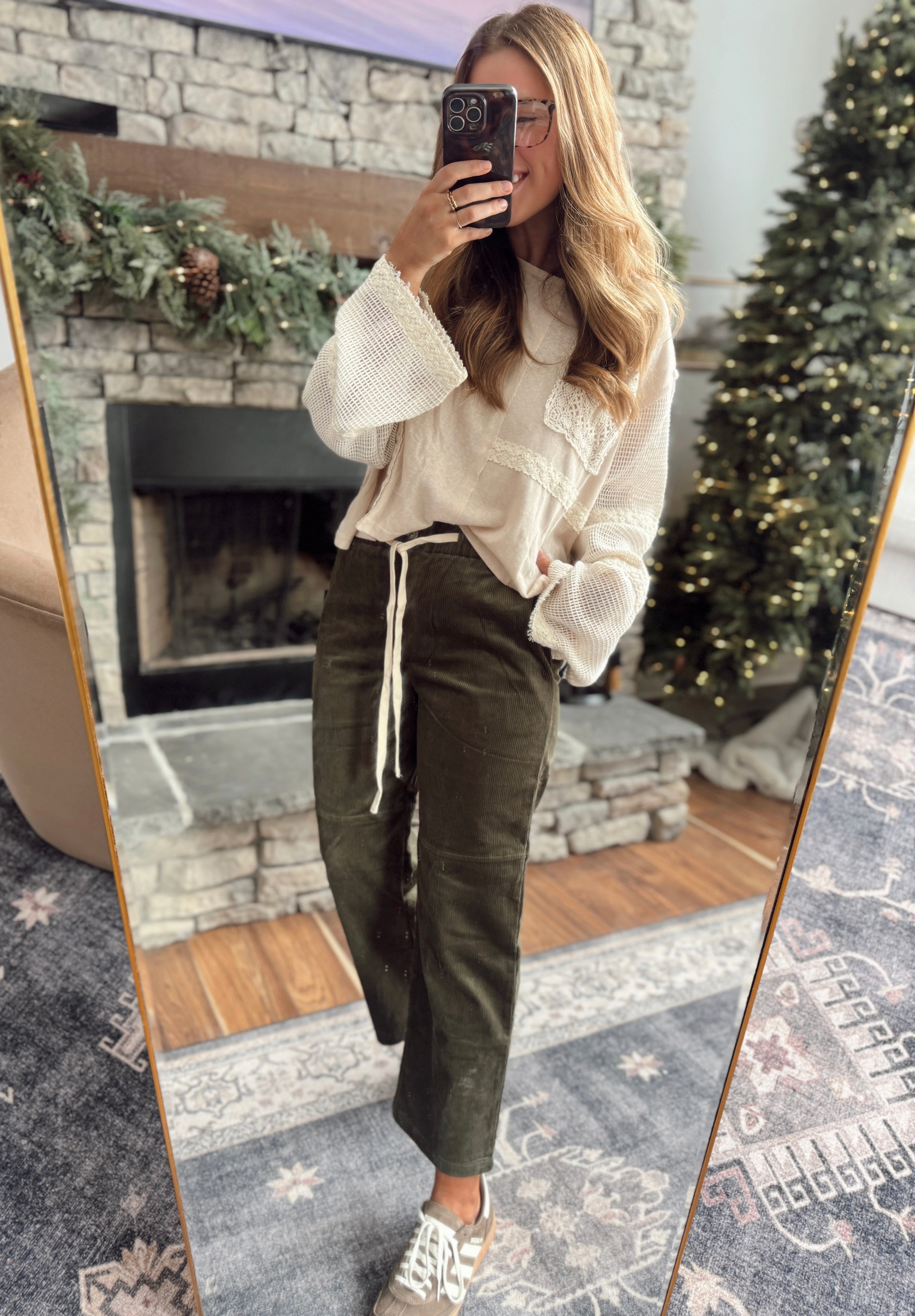 Your new everyday go-to corduroys — soft, comfy, and perfectly structured. These olive straight-leg pants feature an elastic waistband with a functional drawstring, giving you that effortless fit without sacrificing style. Easy to dress up, easy to dress down… truly a closet staple.