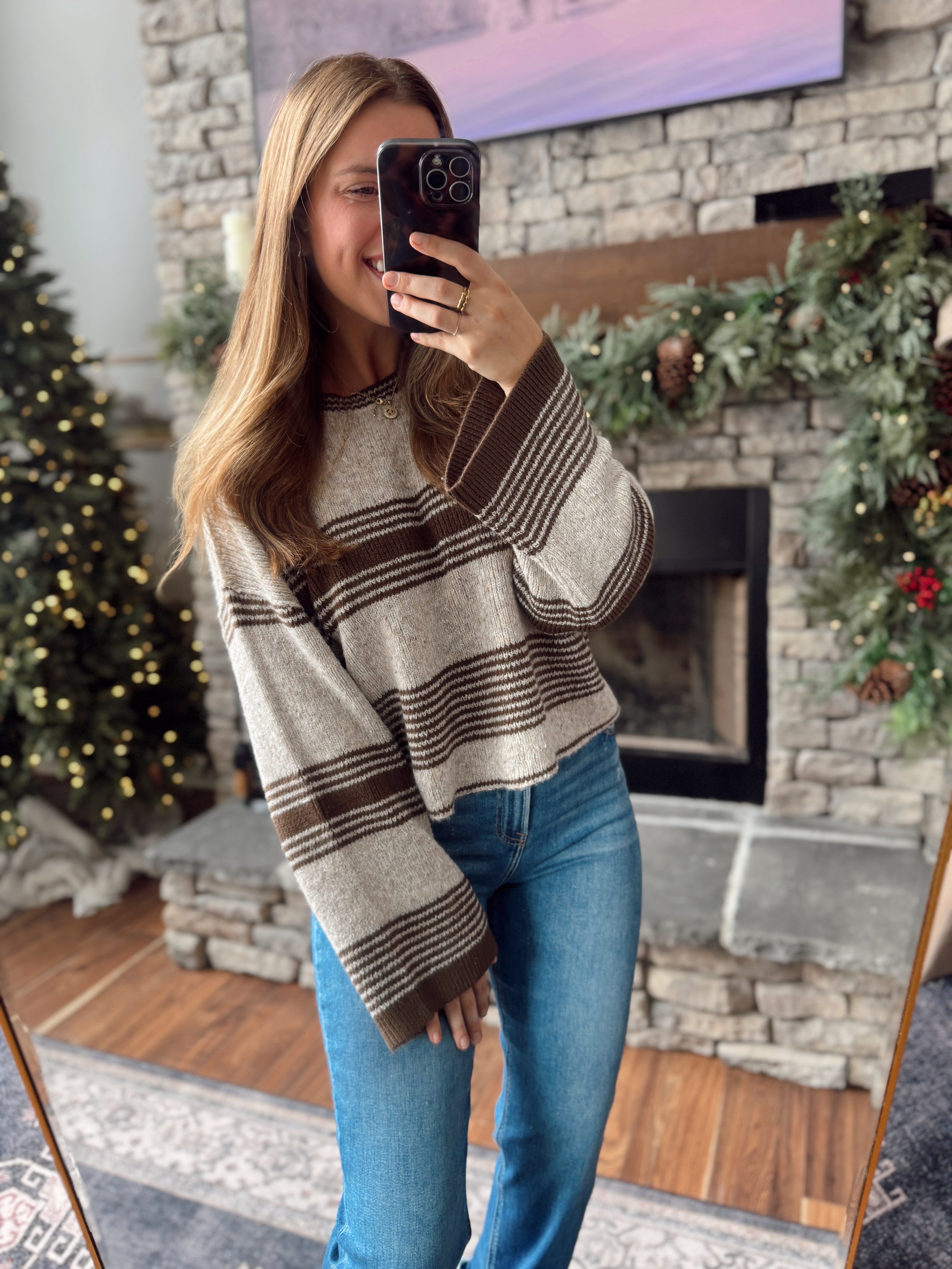 Meet your new go-to neutral. This cozy knit sweater features wide olive (and brown) + oatmeal stripes for that perfectly relaxed, winter-weekend look. The fit is easy, slightly boxy, and pairs effortlessly with denim or leggings. The sleeves have a subtle bell shape for that soft, feminine drape without being oversized.