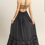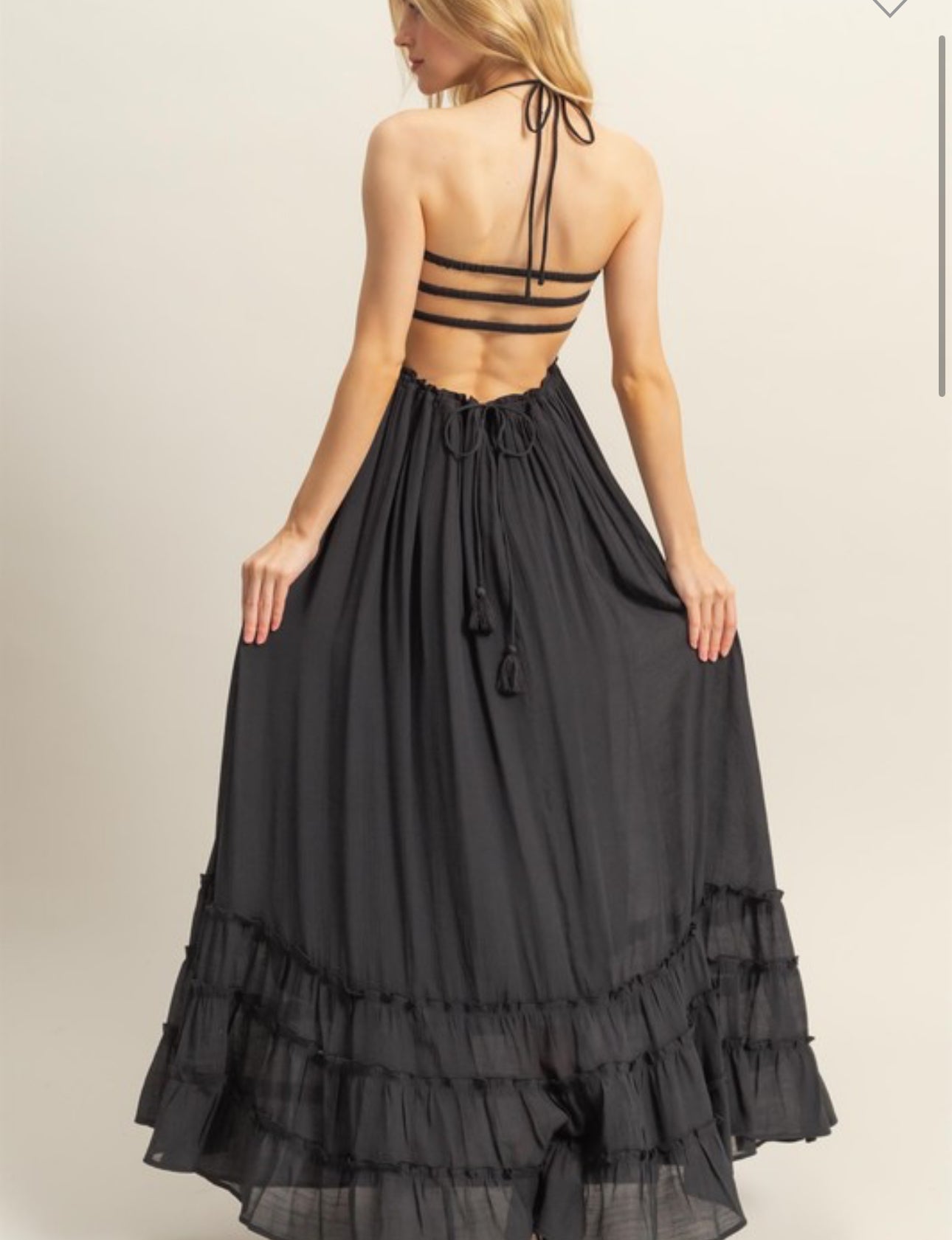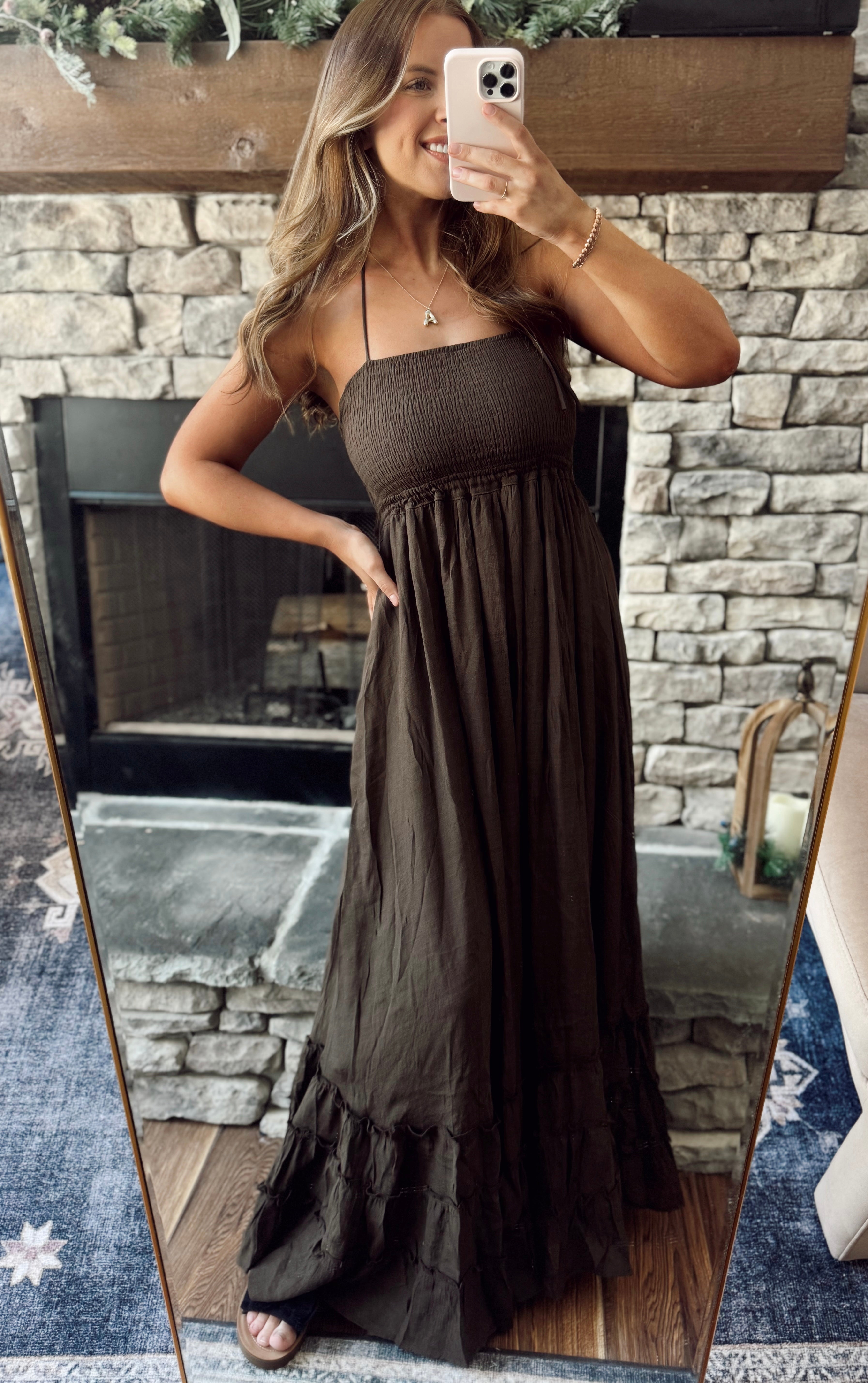 On My Level Mocha Open Back Smocked Tiered Maxi