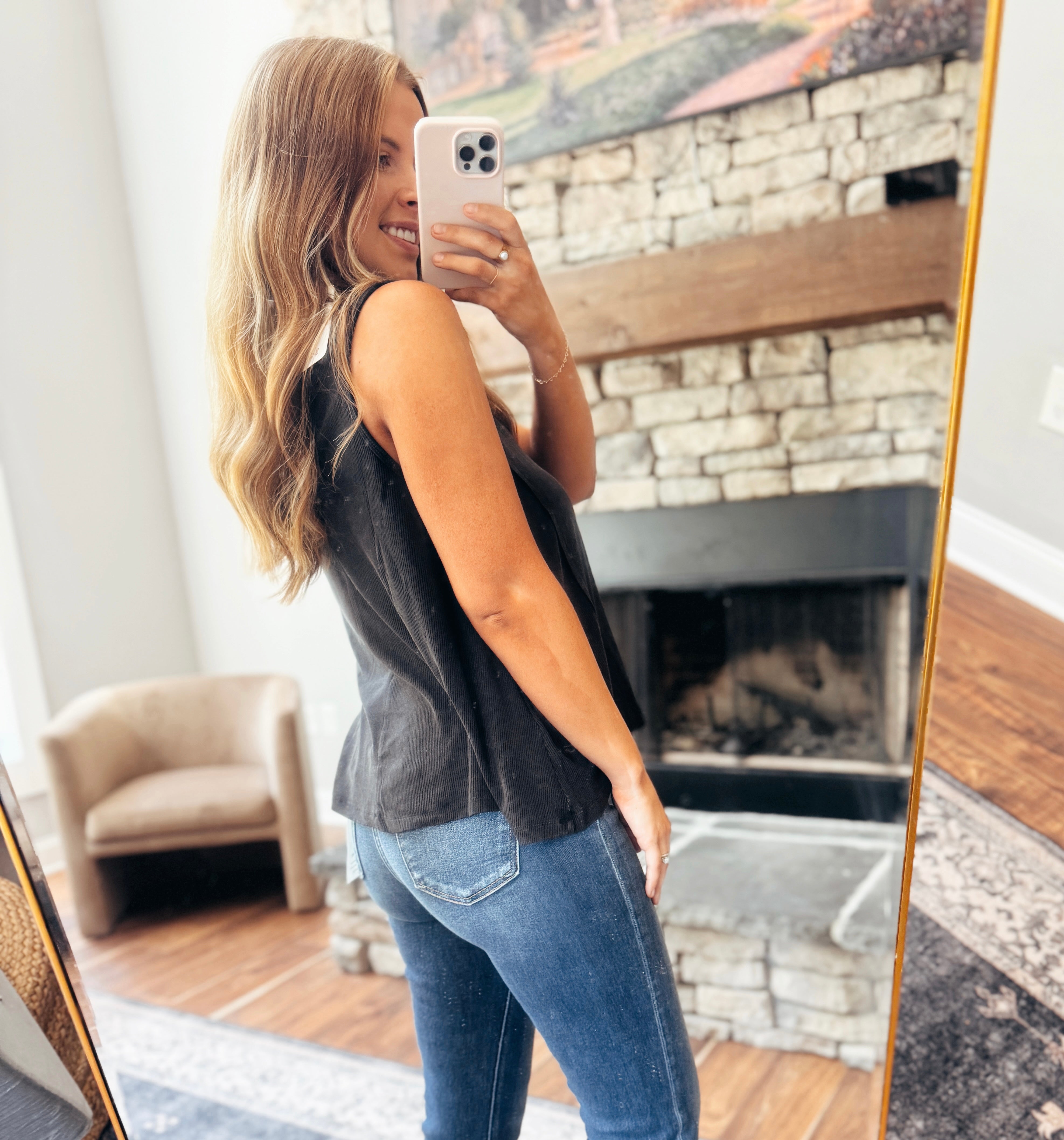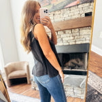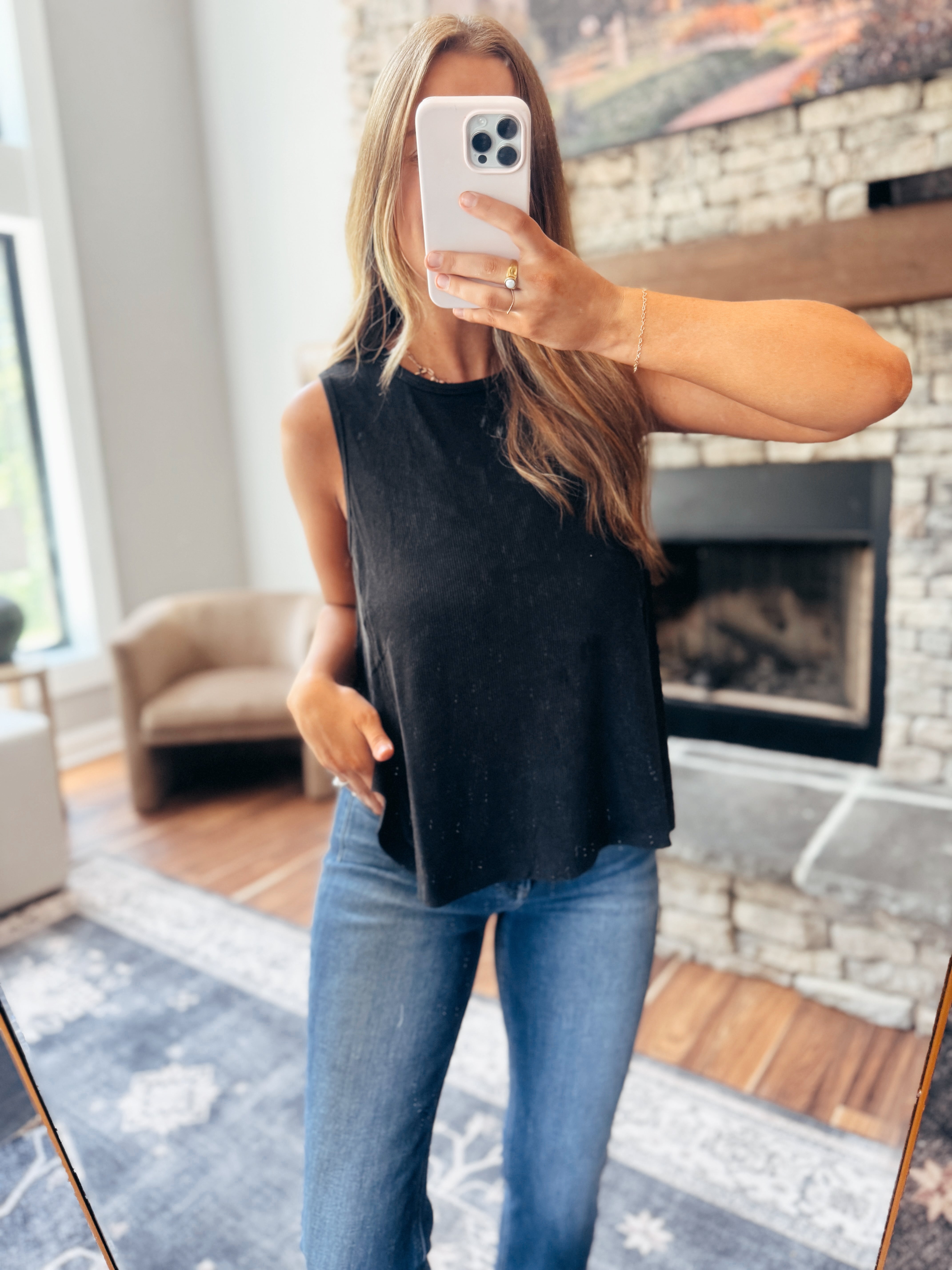 A soft, ribbed black tank with a slight acid wash finish that gives it just the right amount of edge. The relaxed swing fit keeps it comfy and flattering, while the textured ribbing adds that extra touch of style. Wear it solo or layer it up—you’ll be reaching for this one on repeat.