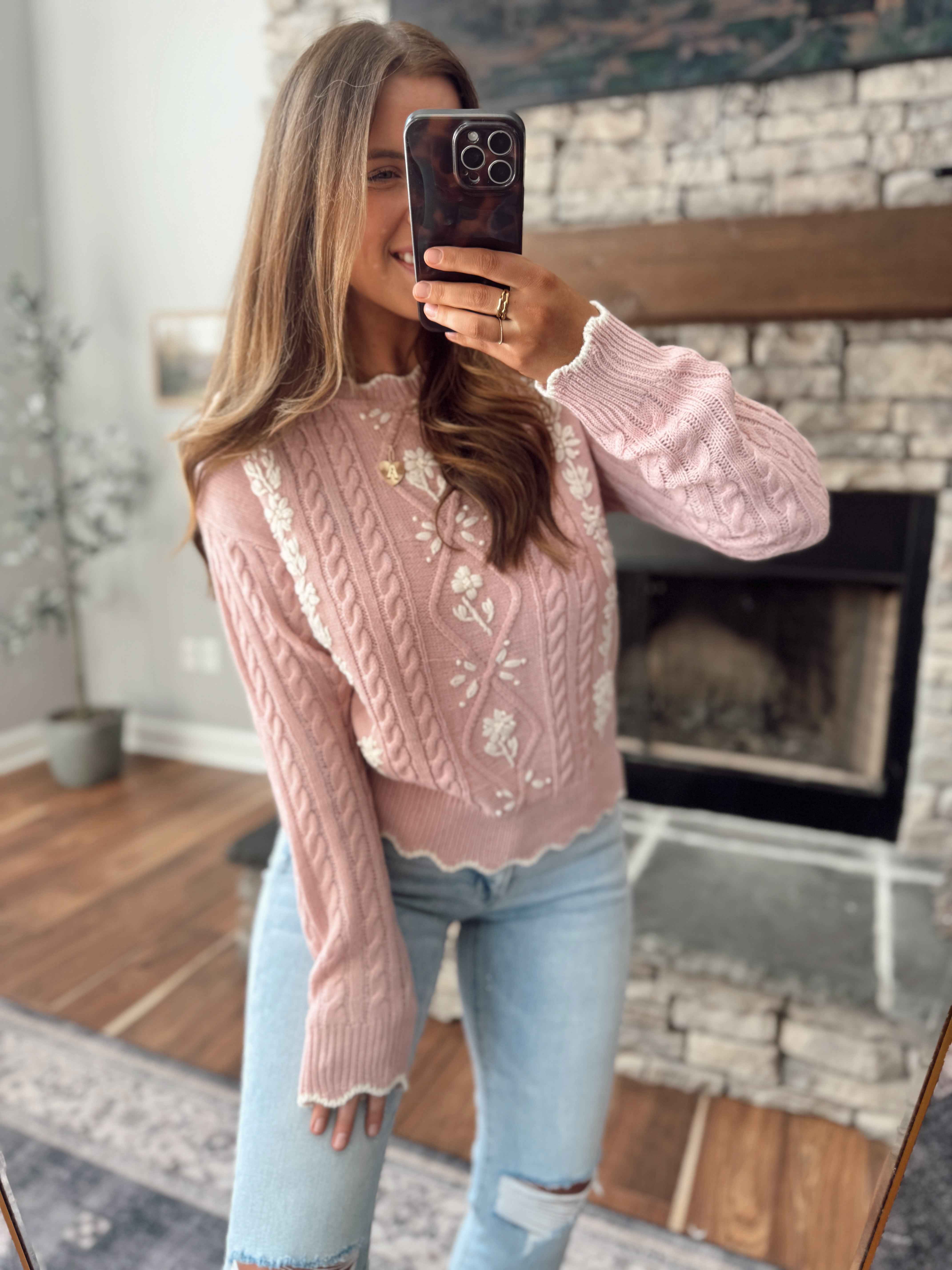 Wrap yourself in cozy charm with this delightful cable knit sweater, adorned with delicate floral embroidery that brings a touch of garden-inspired elegance to your everyday wardrobe. The textured knit provides warmth and comfort, while the thoughtful floral details add personality and whimsy to any outfit. Perfect for layering on crisp days or wearing solo when you want to make a subtle style statement. A timeless piece that celebrates the beauty of nature with every wear.
