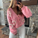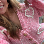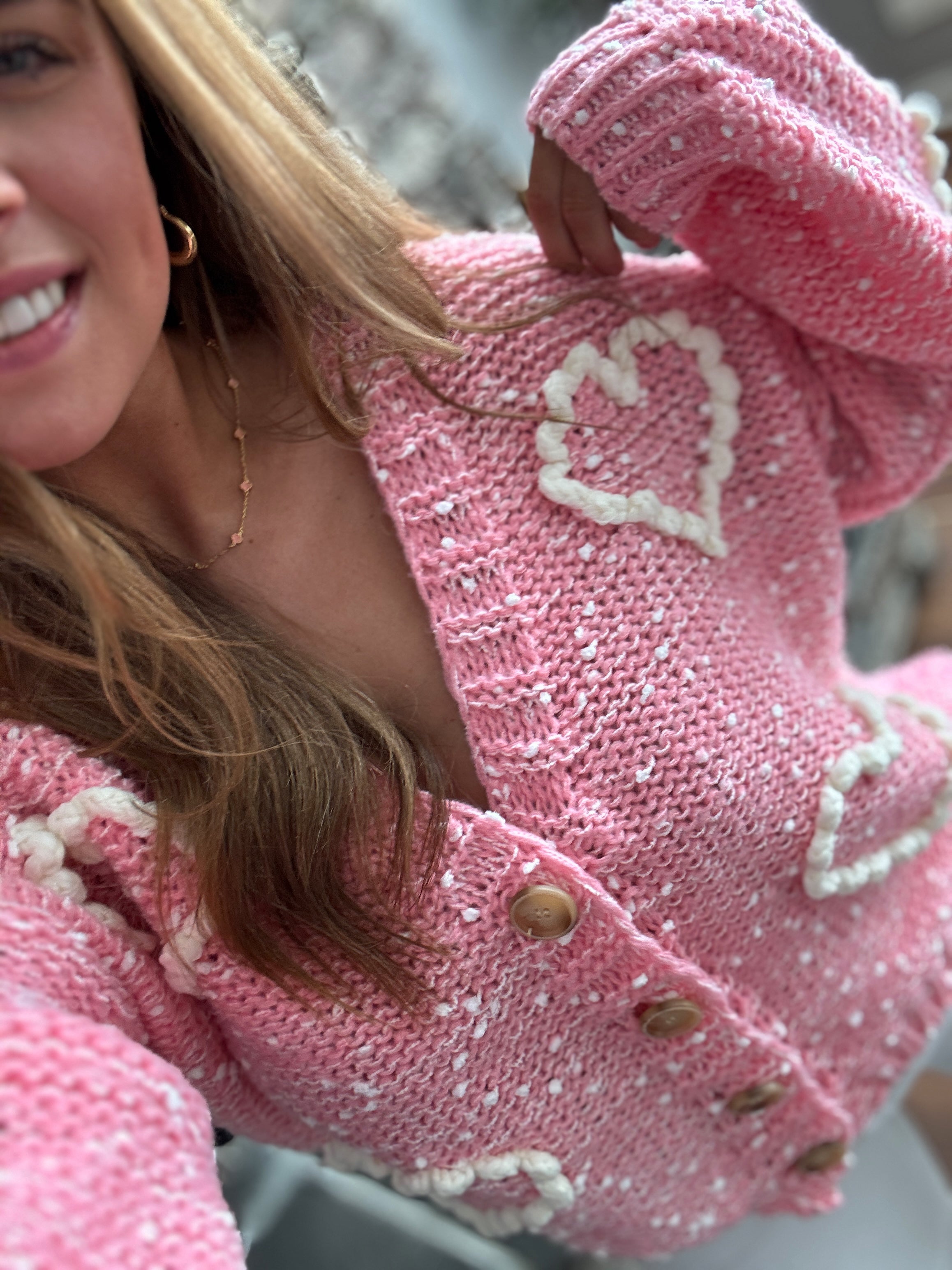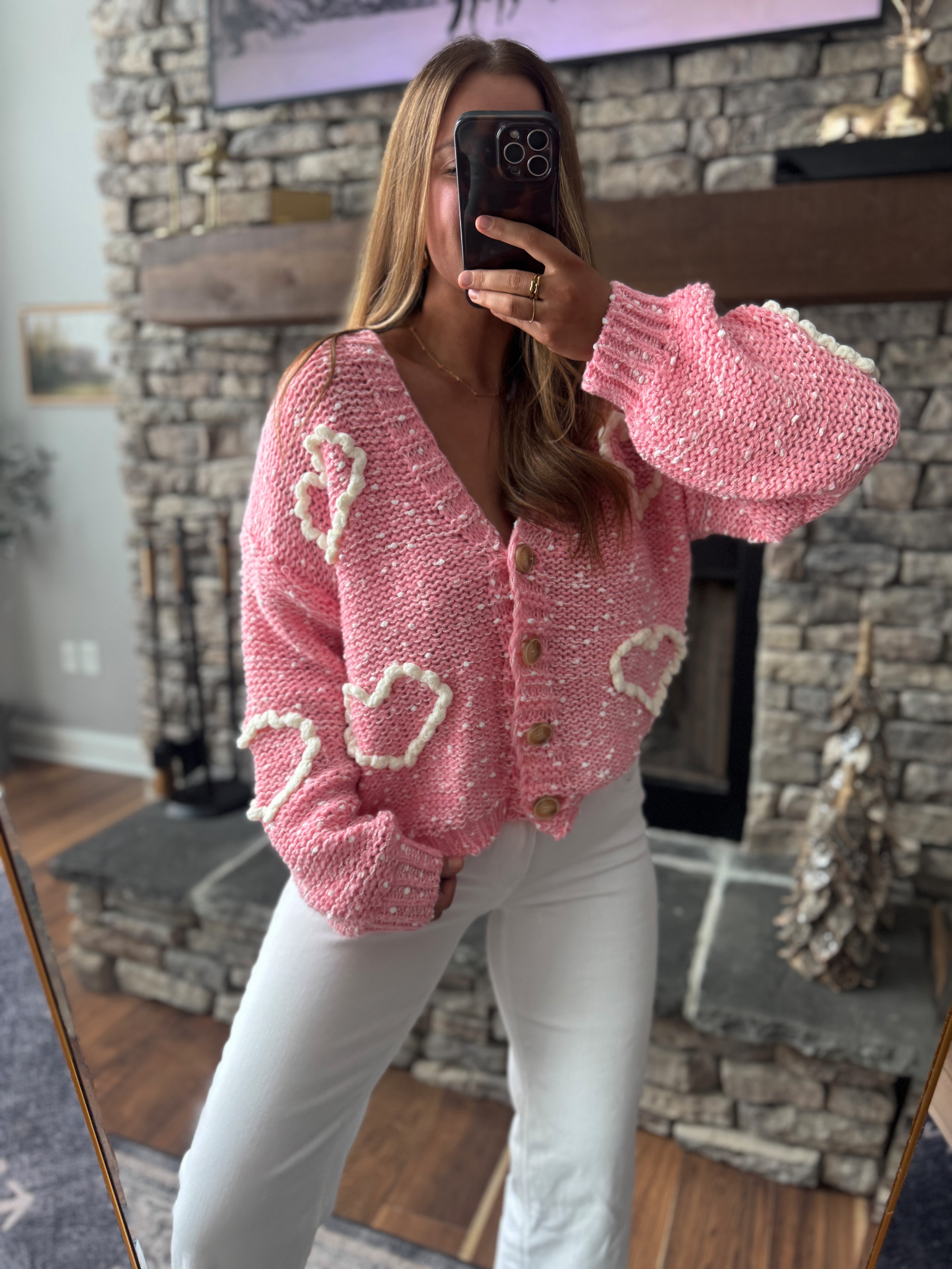 This chunky knit cardigan is full-on heart-eyes material with its soft pink base, textured knit, and adorable cream heart detailing. It’s feminine, playful, and still totally wearable.