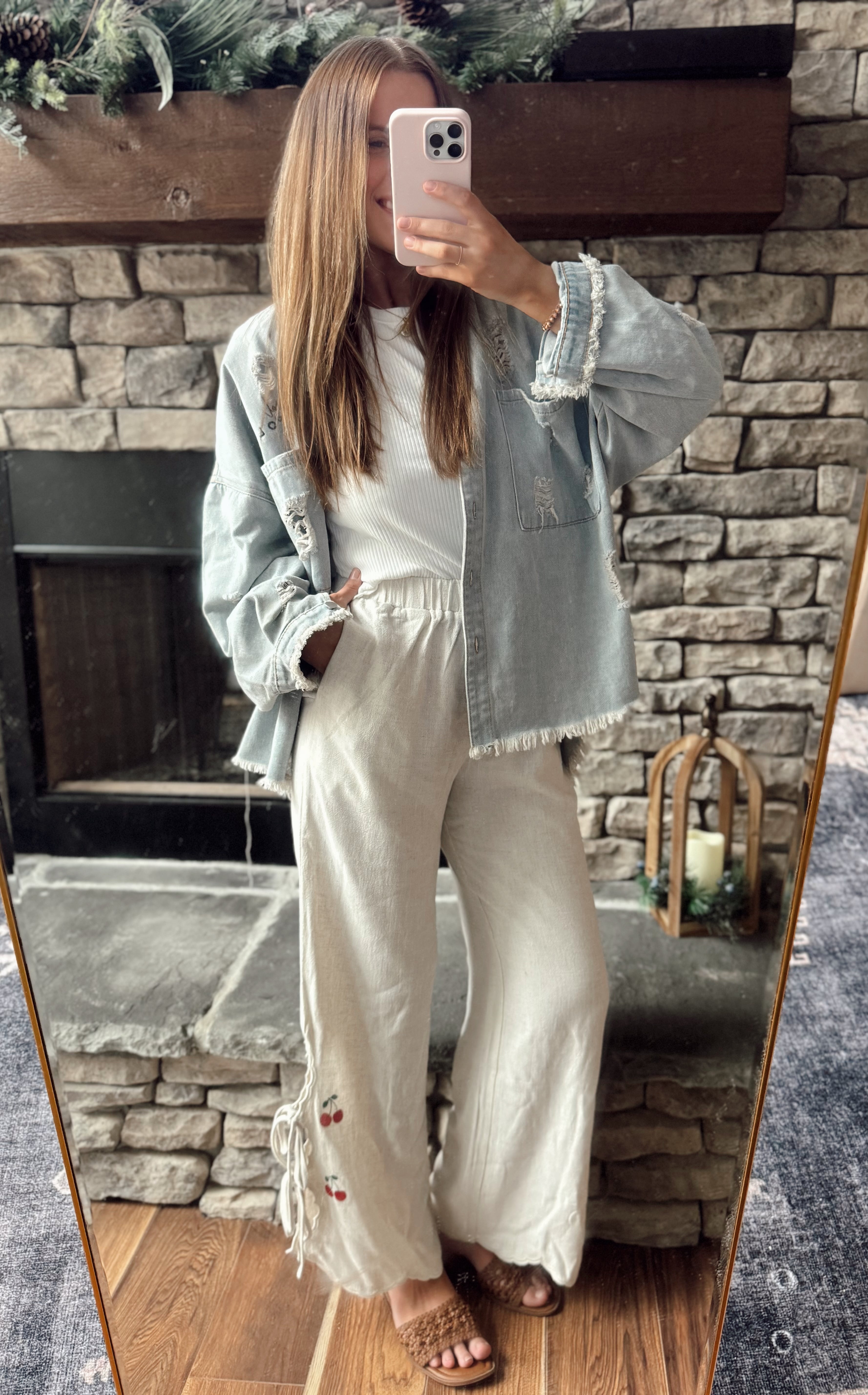 Pops Of Cherries Natural Linen Embroidered Pants with Scallop Hem