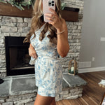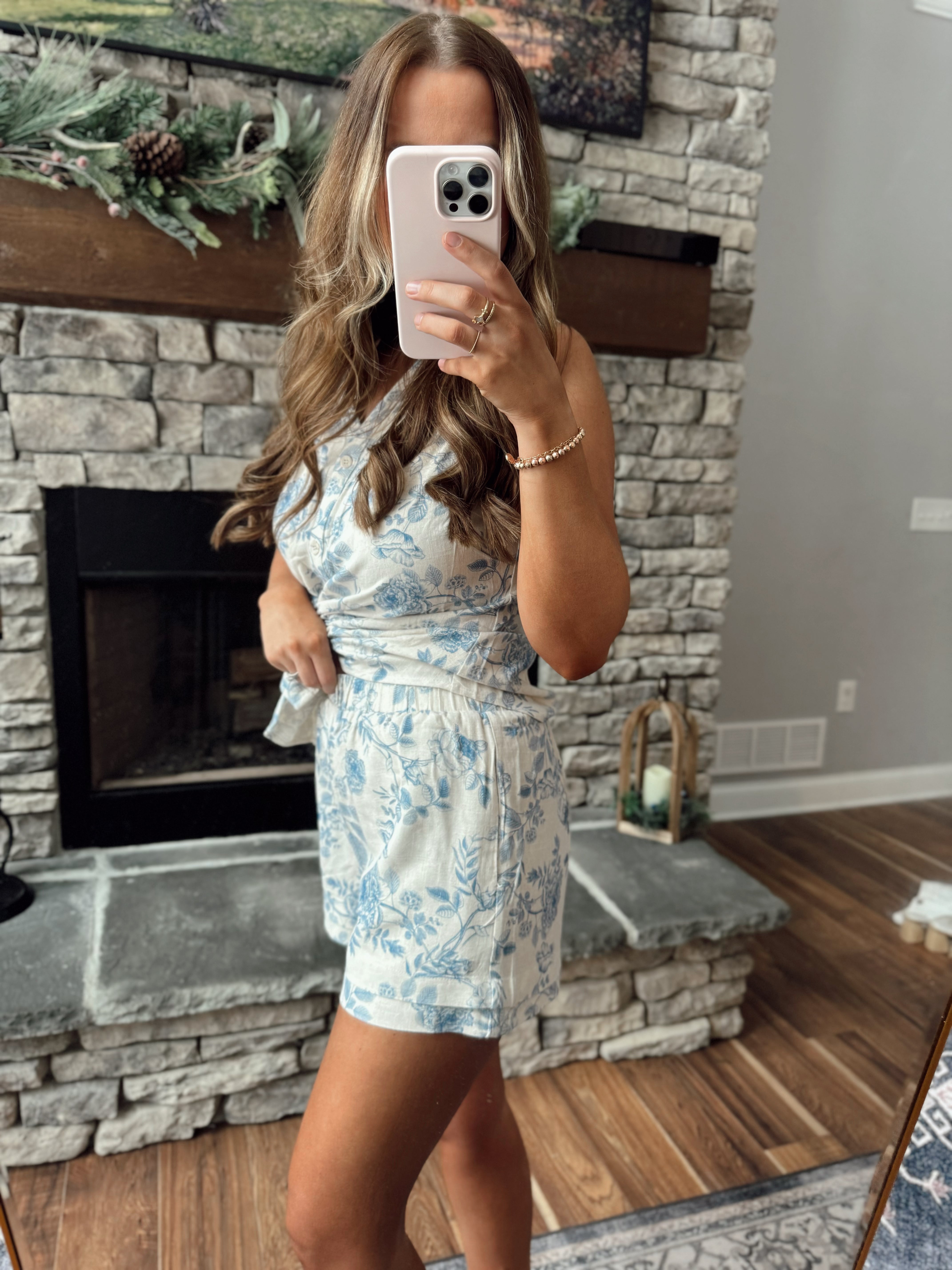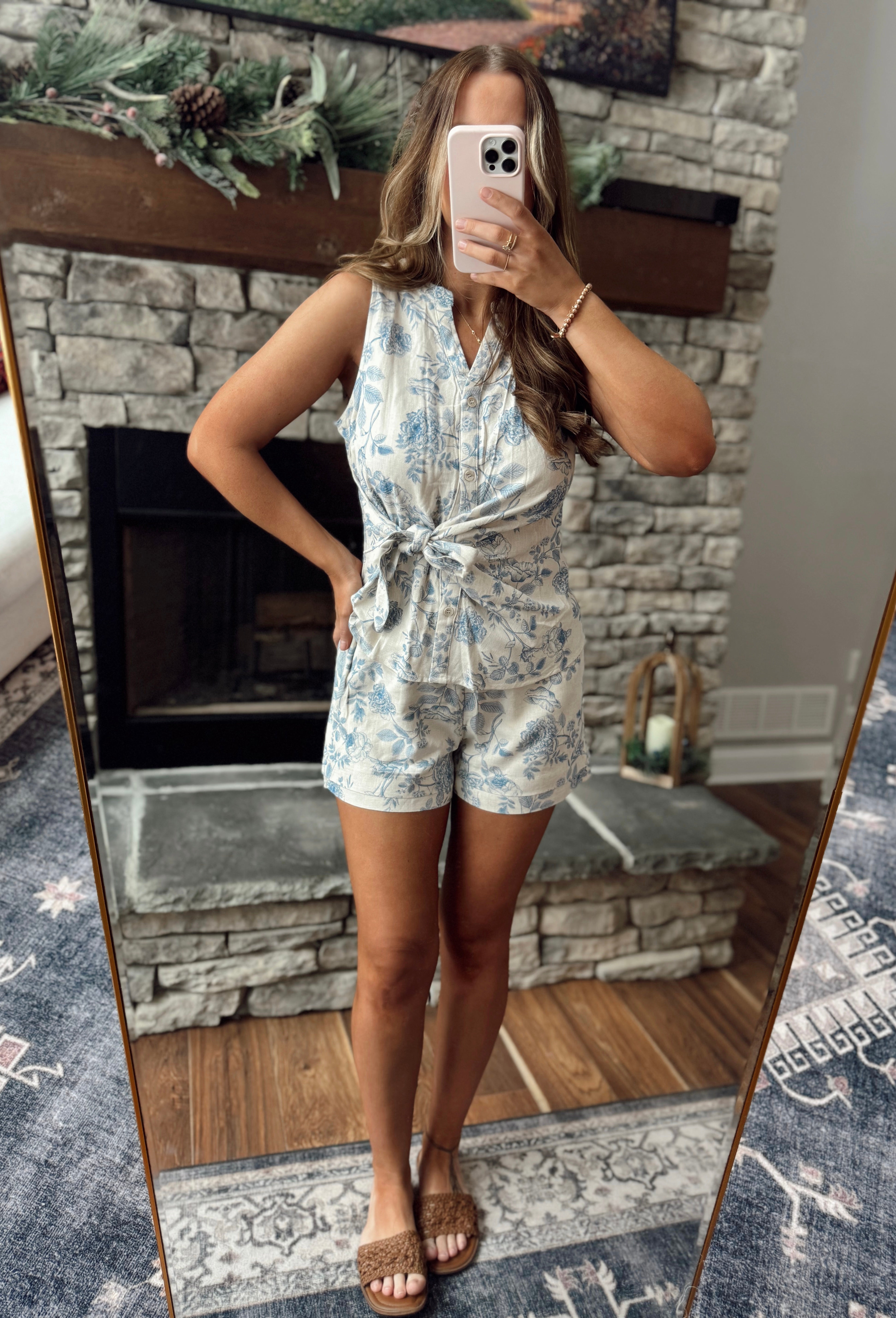 Prettiest Blue Blossoms Linen Shorts with Layered Hem