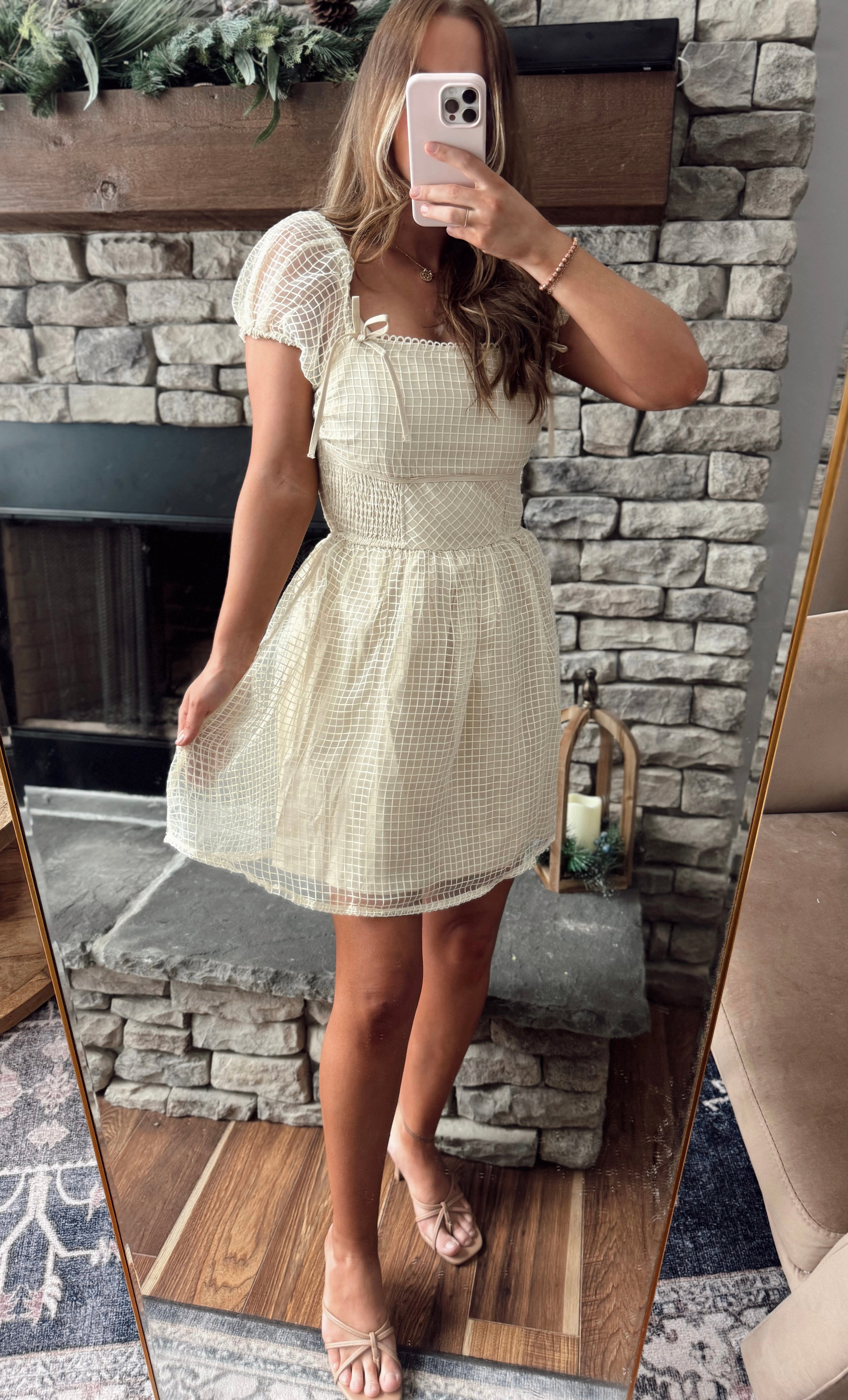 Puff & Play Ecru Square Neck Gingham Mesh Mini