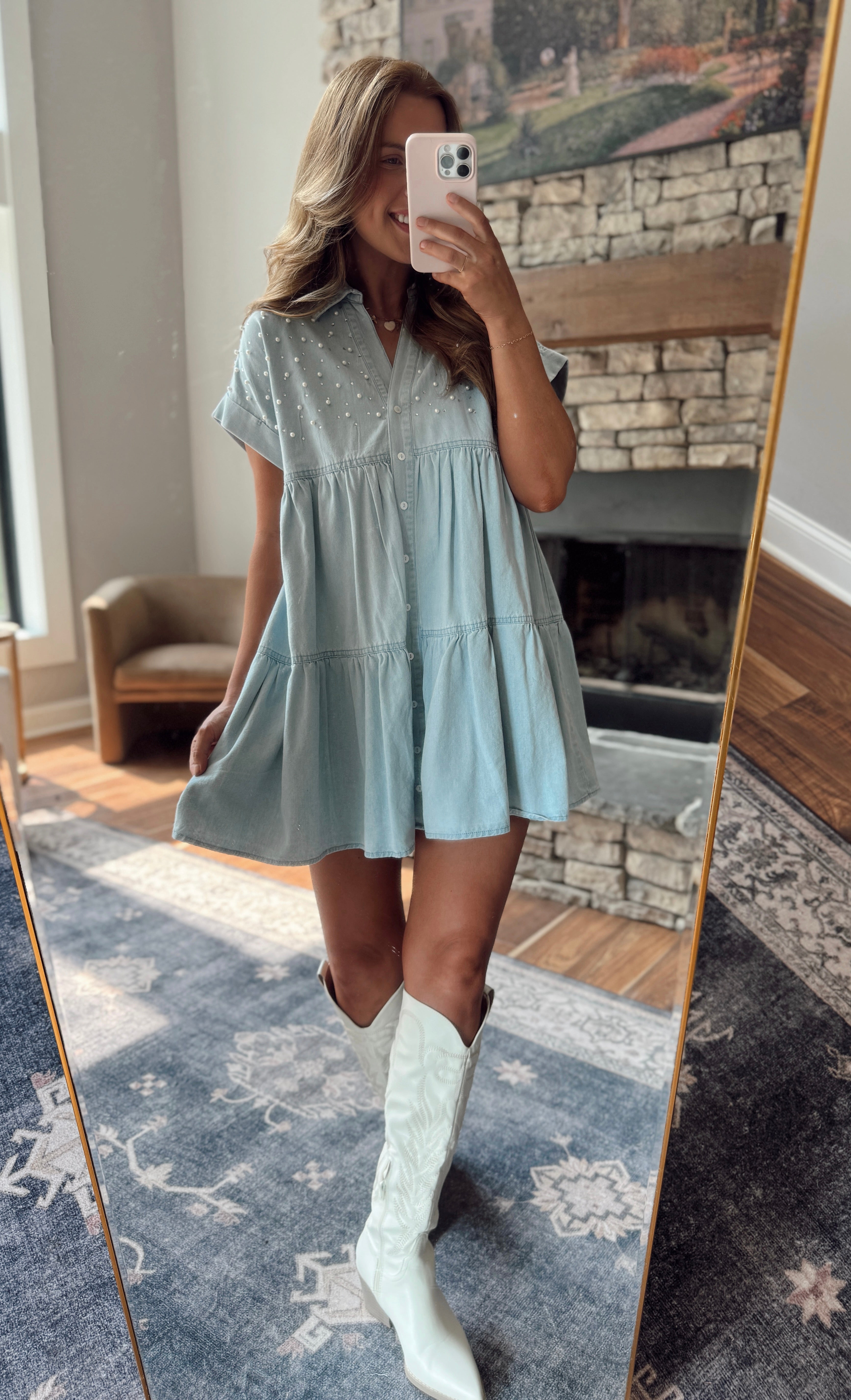 Pulling Out the Stops Denim Studded Short Sleeve Button Down Mini