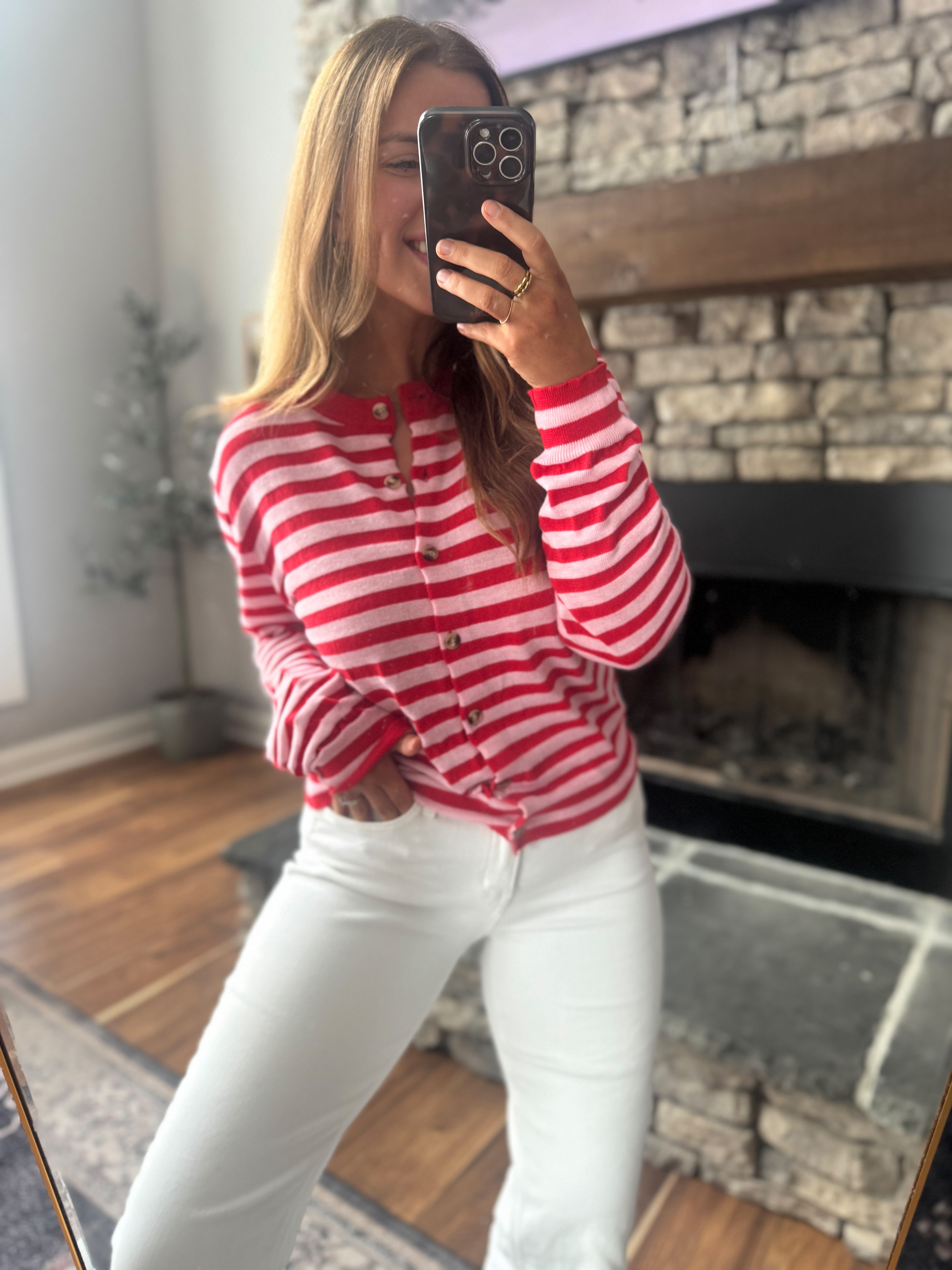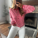 An easy everyday staple with a pop of color. This striped knit top features a flattering button-front design and soft stretch fabric that feels comfy while still looking put together. Perfect worn buttoned up or slightly open for a relaxed, casual vibe.