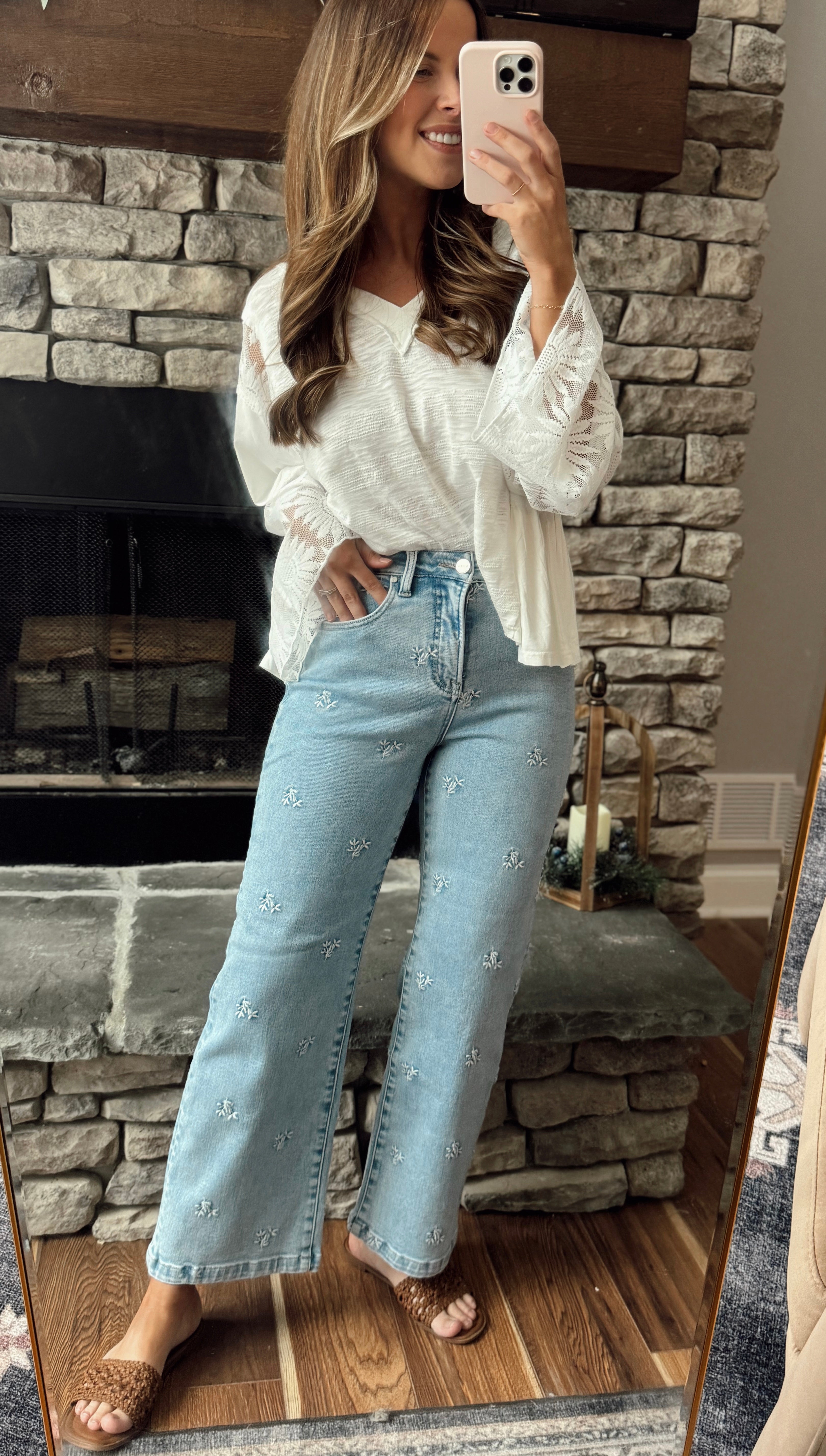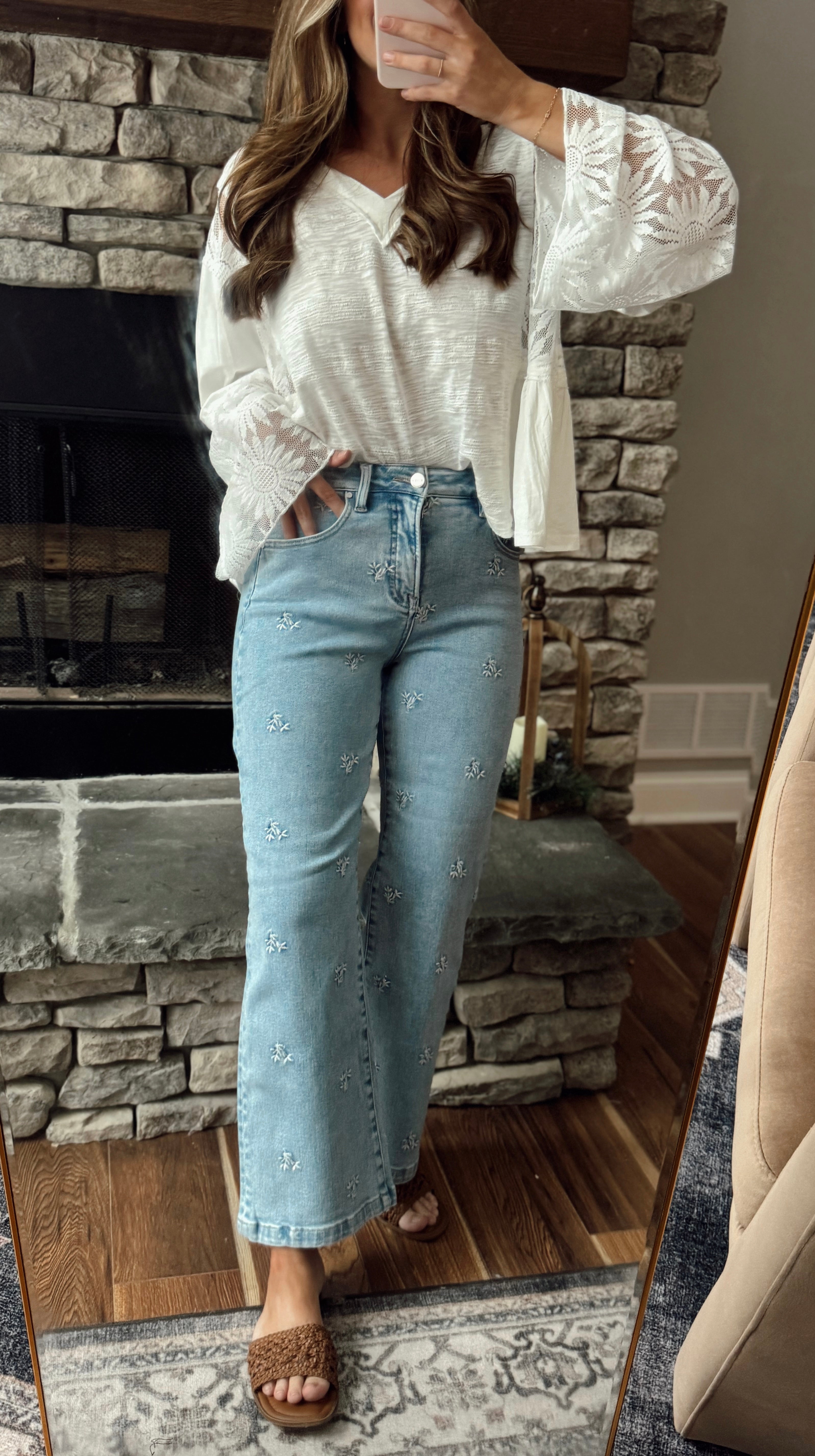 These stylish high rise jeans feature beautiful floral embroidery, a light wash, and a cropped, slim wide leg design. Elevate your wardrobe and embrace your unique style with these must-have jeans.