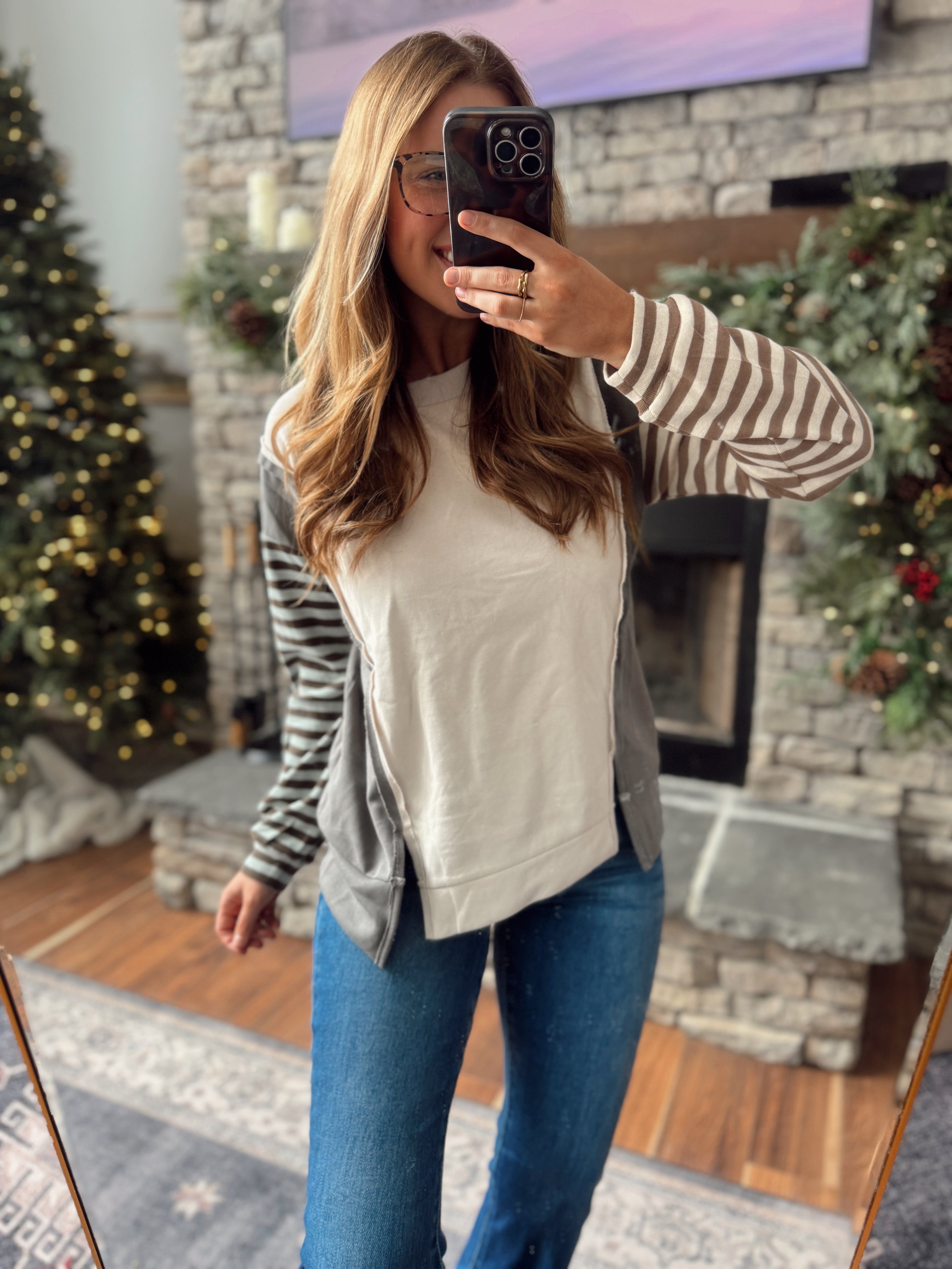 This long-sleeve colorblock tee brings all the effortless vibes with a soft cream front, charcoal side panels, and playful striped sleeves in two complementary neutrals. The mix-and-match design feels unique without trying too hard—aka perfect for school drop-off, errands, or chilling by the tree.