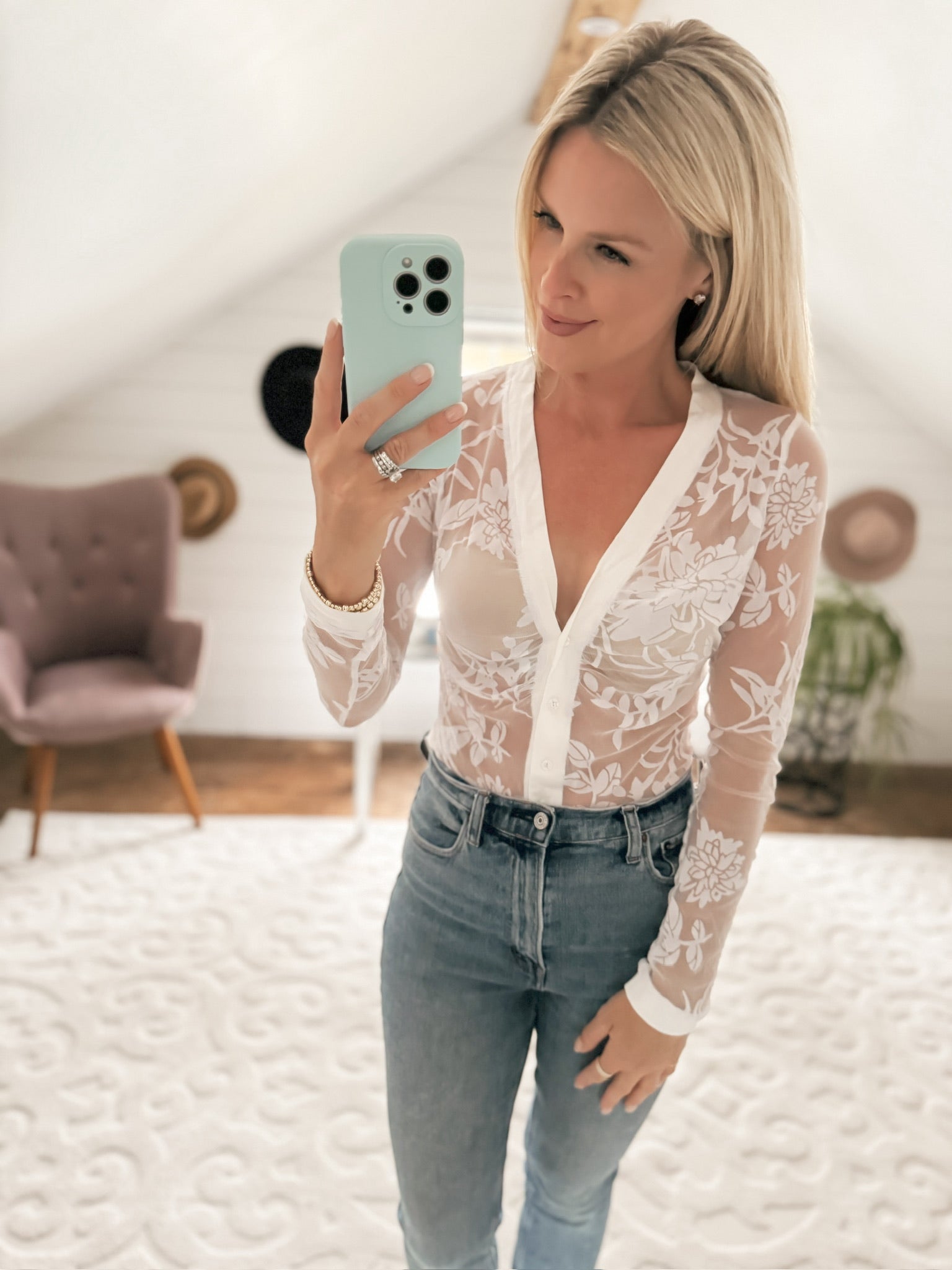 Absolutely love this bodysuit! Even adorable paired under denjm overalls & jumpsuits. True to size fit & obviously see through :)