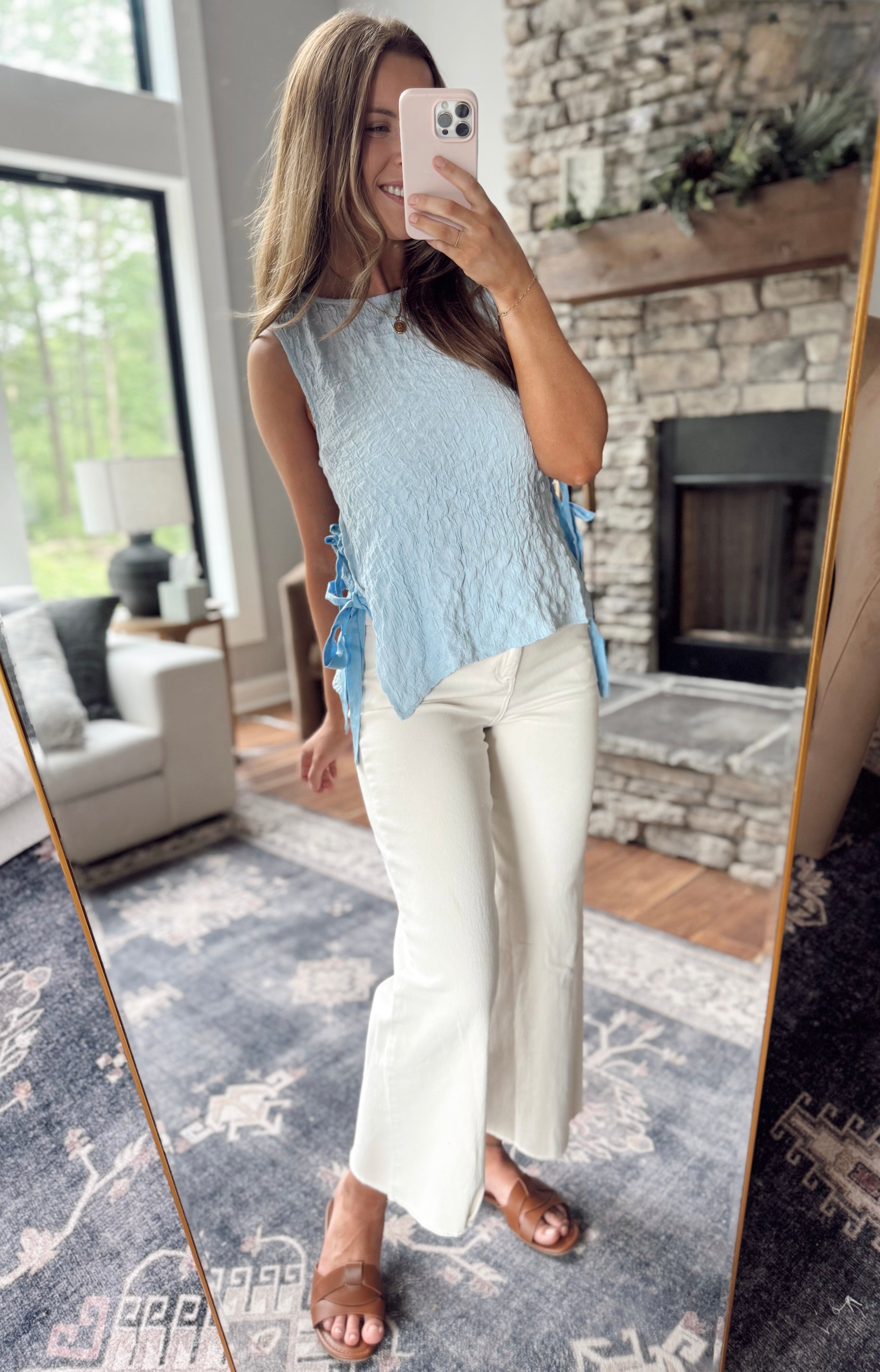 The crinkle material is light, breathable and flattering! A relaxed fit!