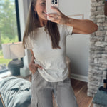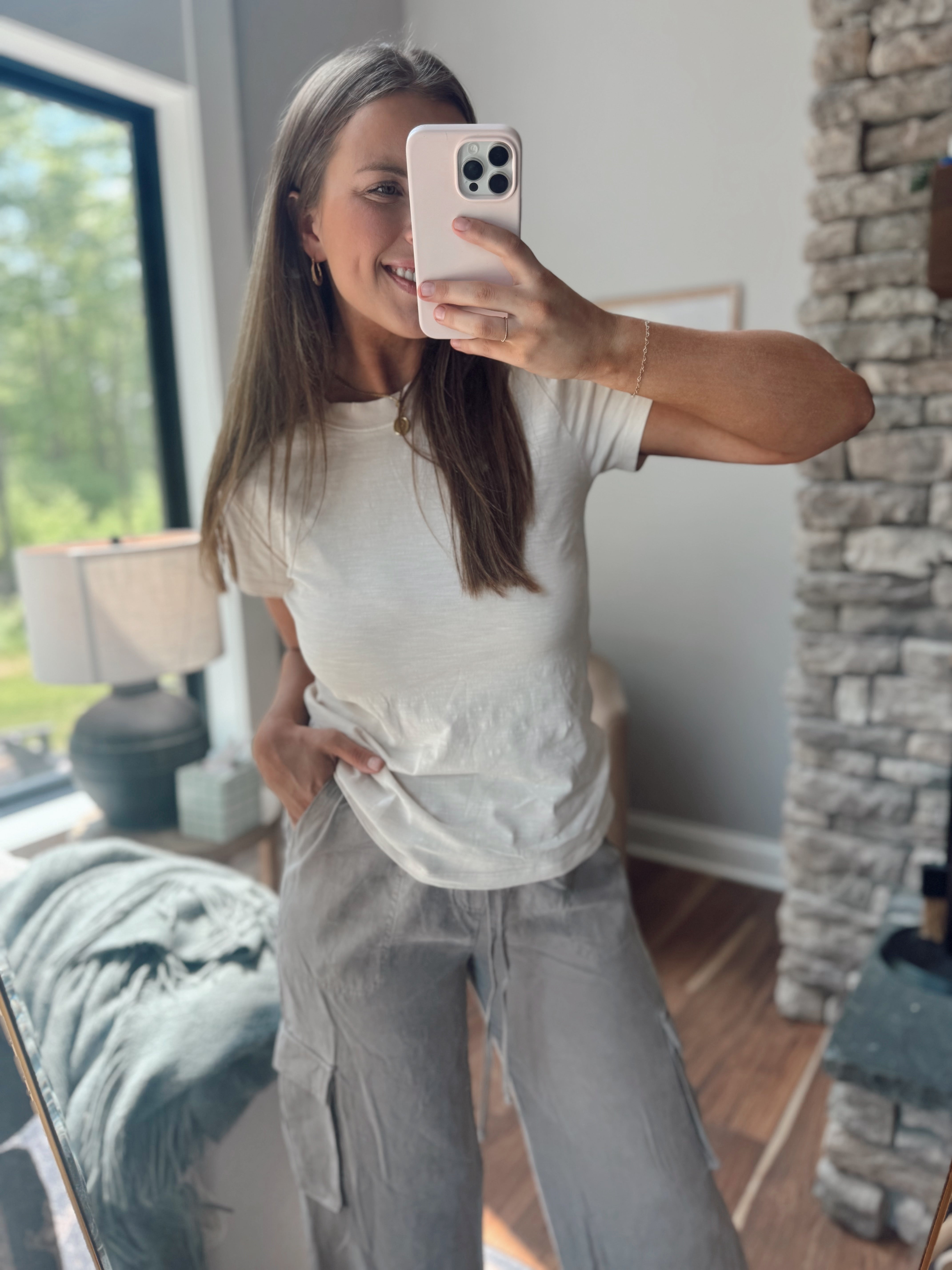 100% cotton and so good! Very lightweight - relaxed fit! So cute on and breathable for summer.