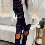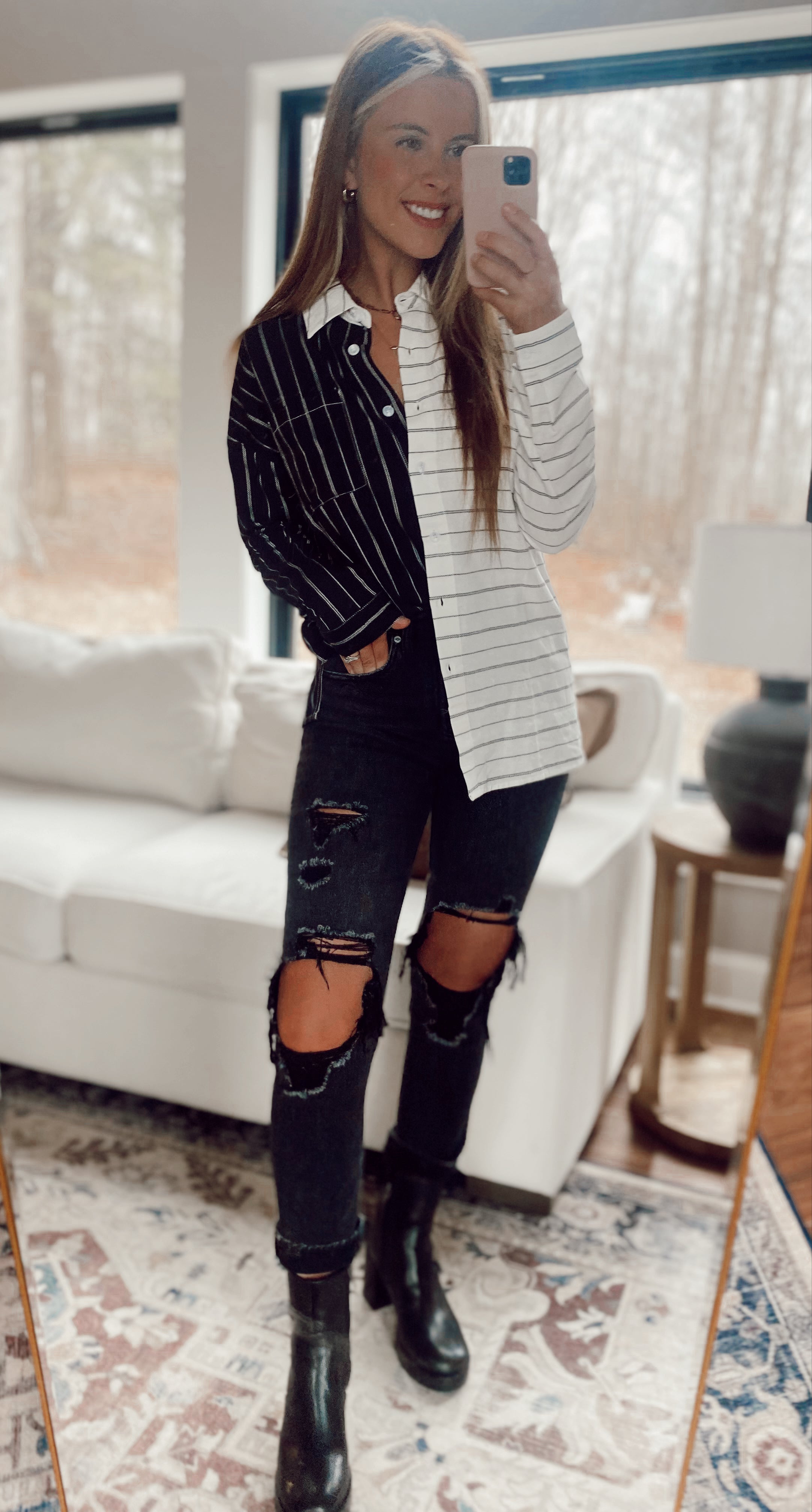 Switching Sides White/ Black Stripe Colorblock Button-up