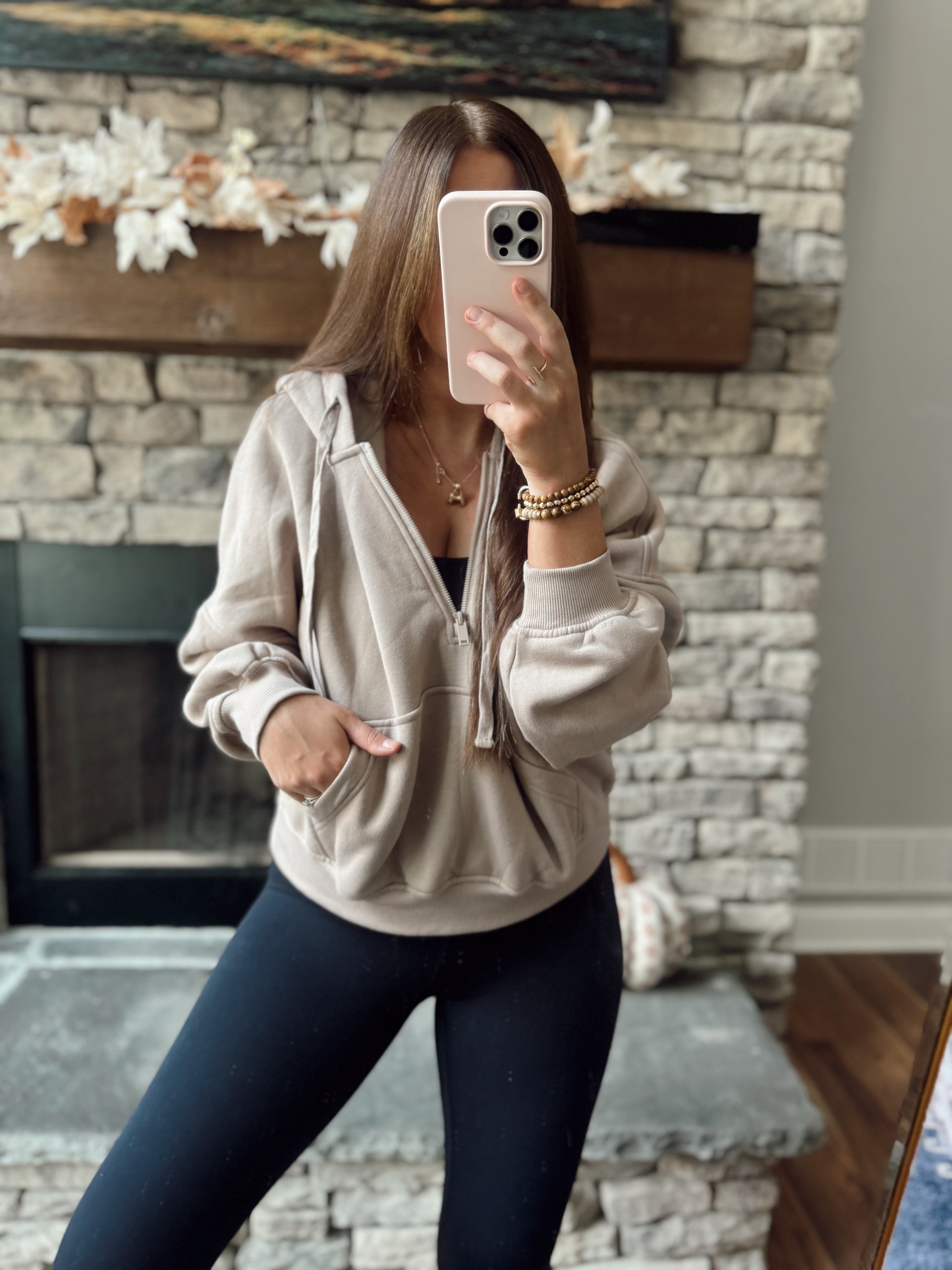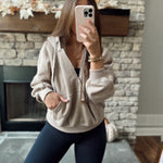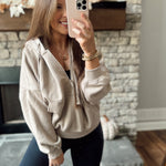 Taupe Oh So Comfy French Terry Fleece Quarter Zip with Hood