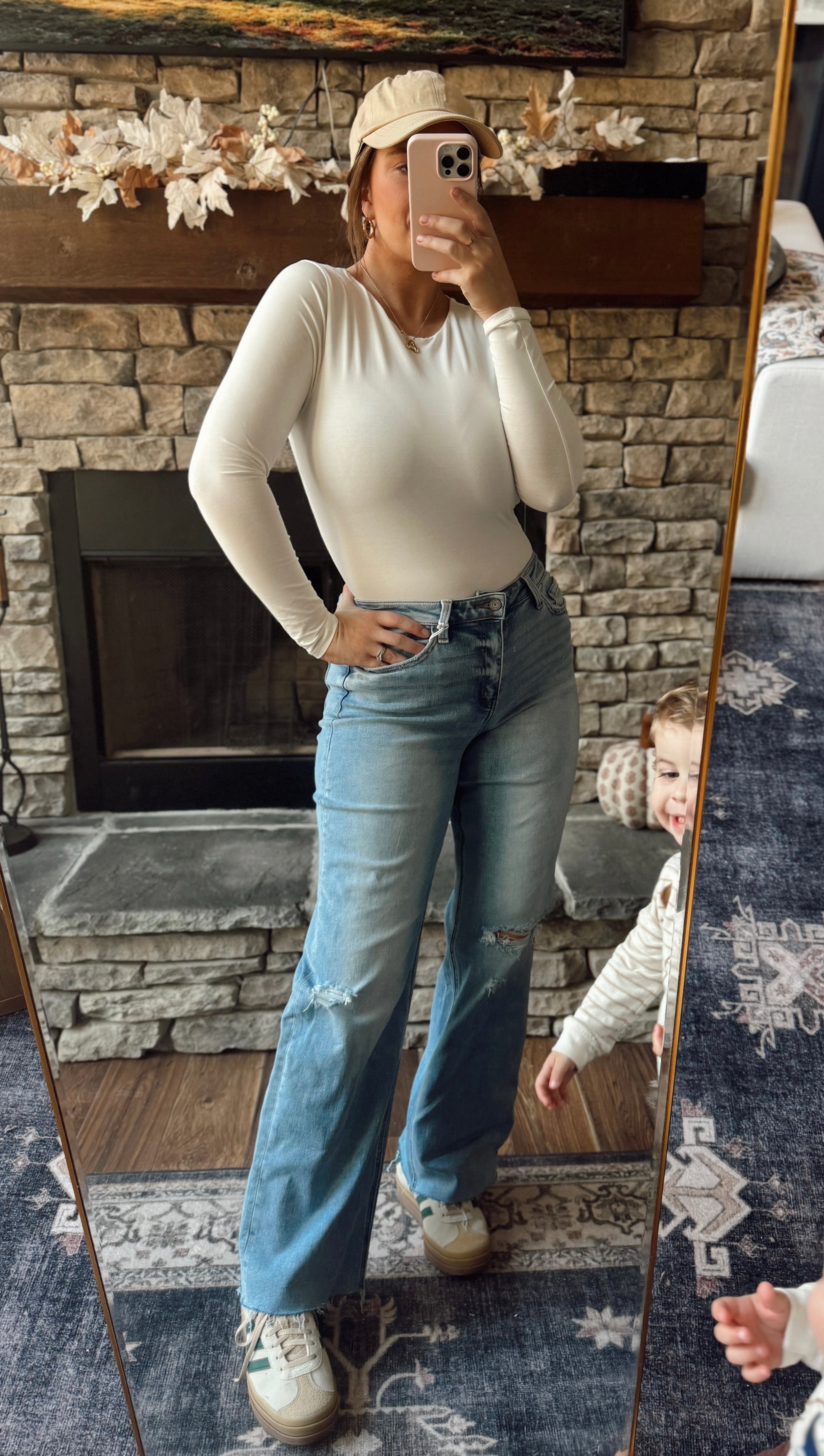 COMFORT STRETCH DENIM, HIGH RISE WAIST, DISTRESSED DETAIL, CLEAN CUT RAW HEM, FULL LENGTH, WIDE LEG JEANS