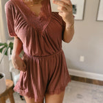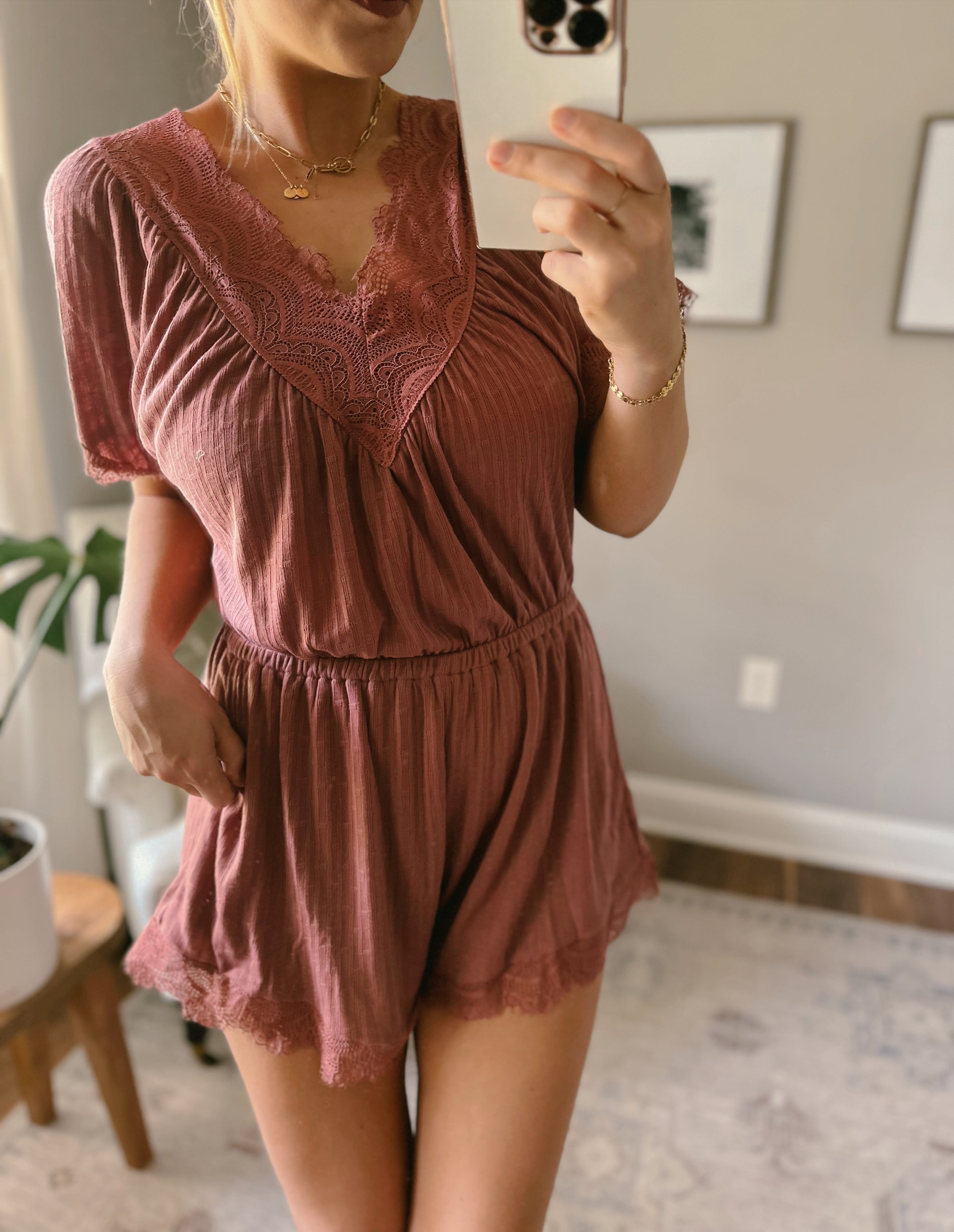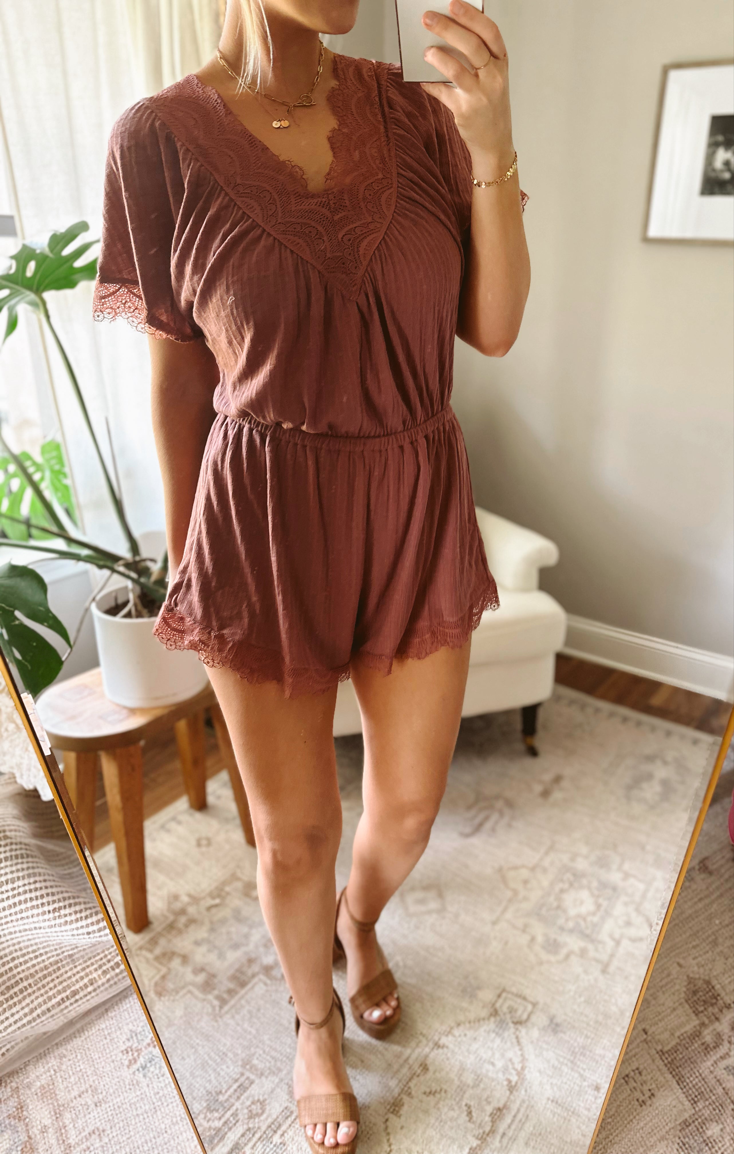 Loose fit romper with lace detail! Relaxed fit ( can size down if in between..!) super gorgeous