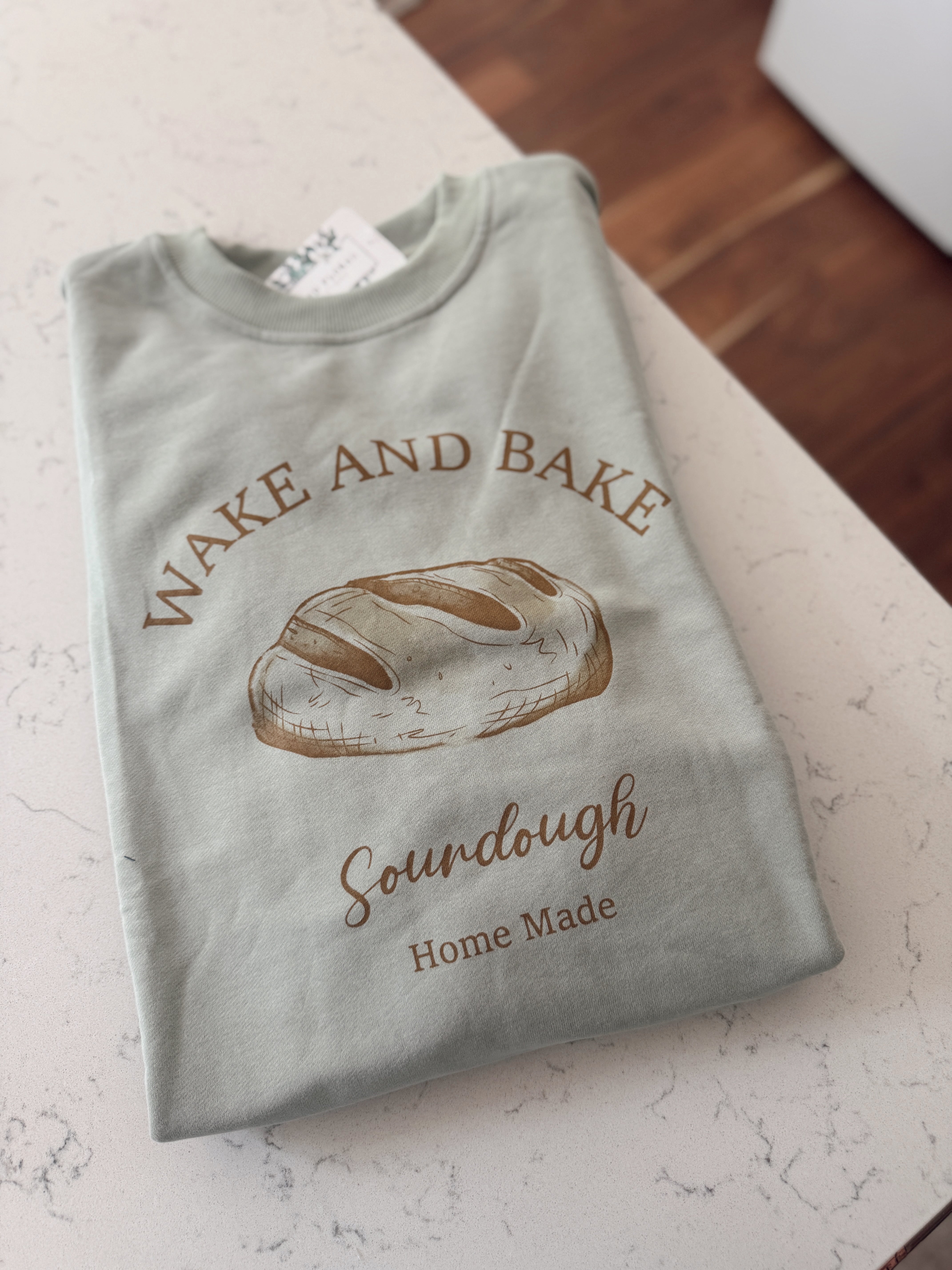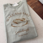 - “Wake and Bake” sourdough graphic in warm brown tones