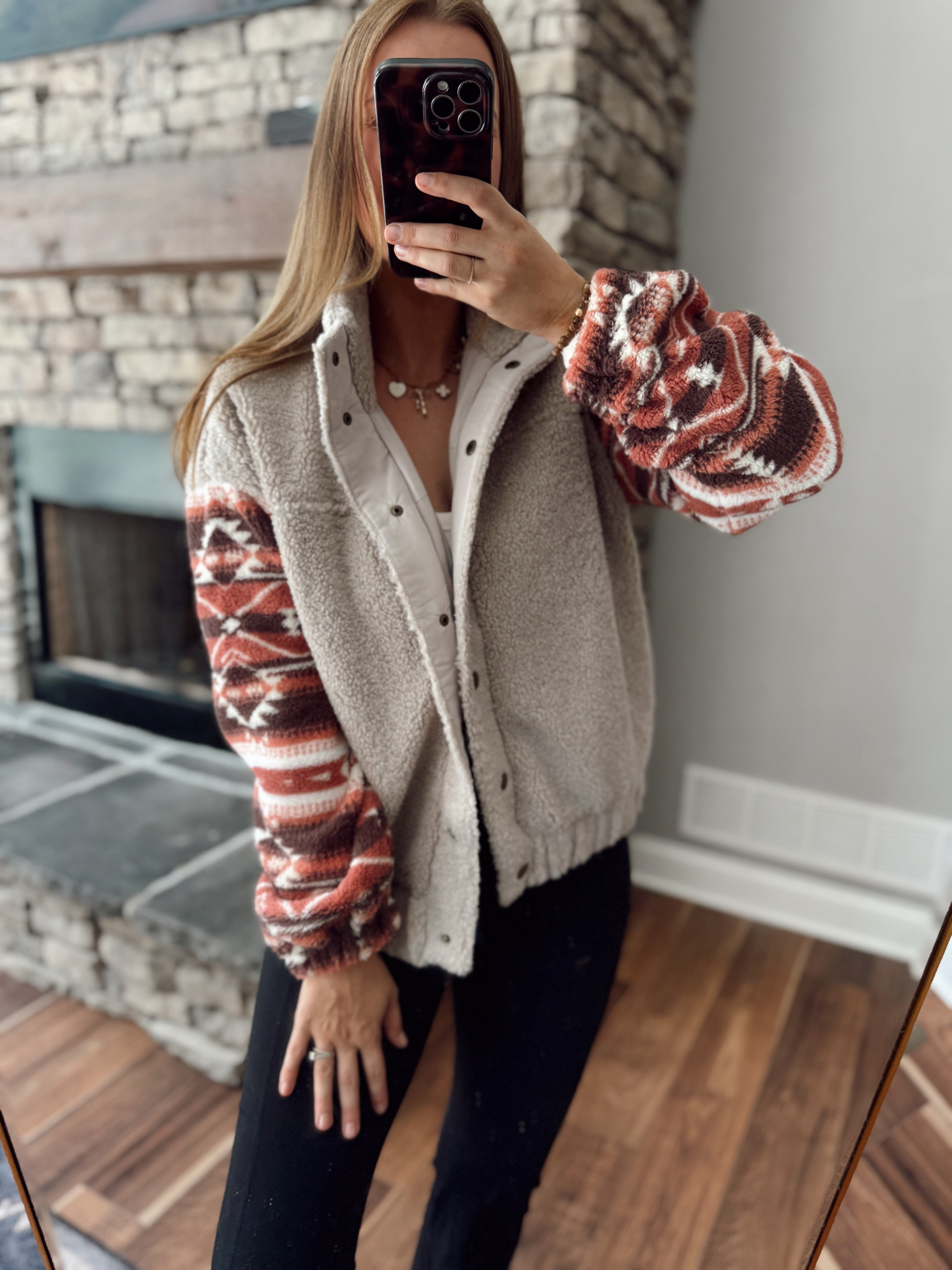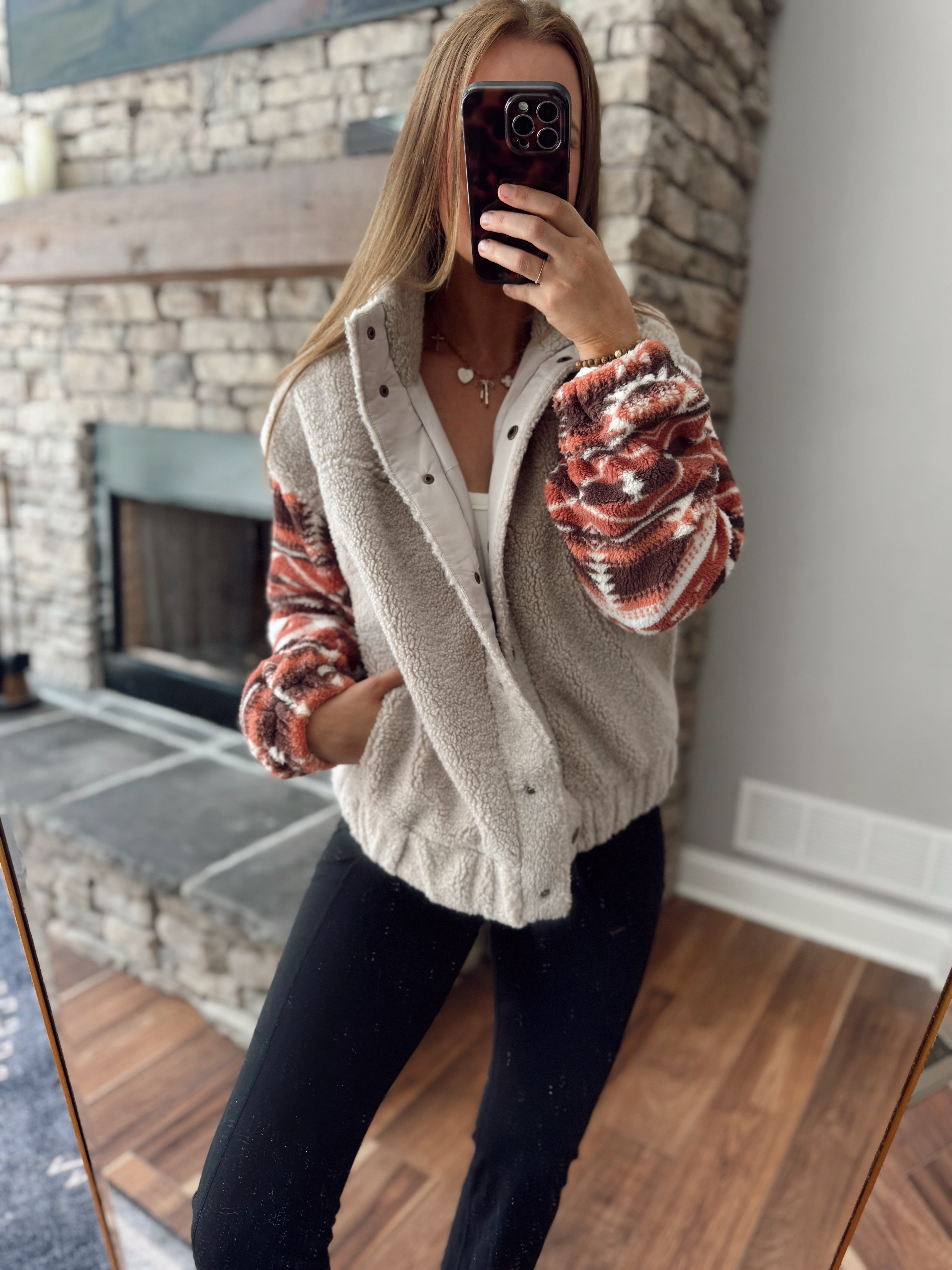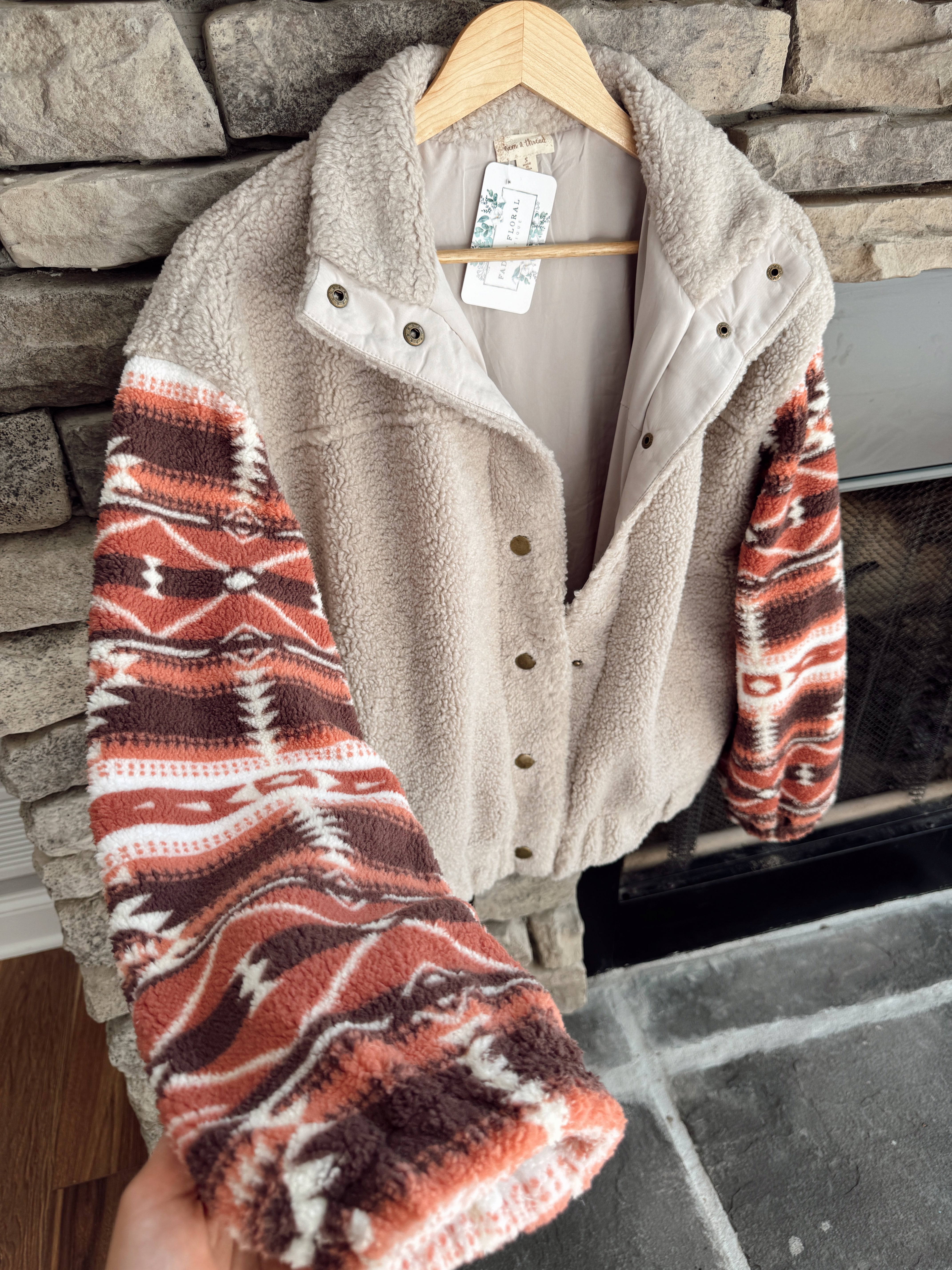 When cozy meets statement style. This ultra-soft sherpa jacket features a neutral beige body that’s endlessly wearable, paired with bold Southwest-inspired patterned sleeves in rich rust, brown, and cream tones. Snap-button front, high collar, and a relaxed fit make it the perfect throw-on-and-go layer. Whether you’re running errands, heading to a bonfire, or styling it for a casual day out, this jacket brings warmth and personality.