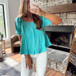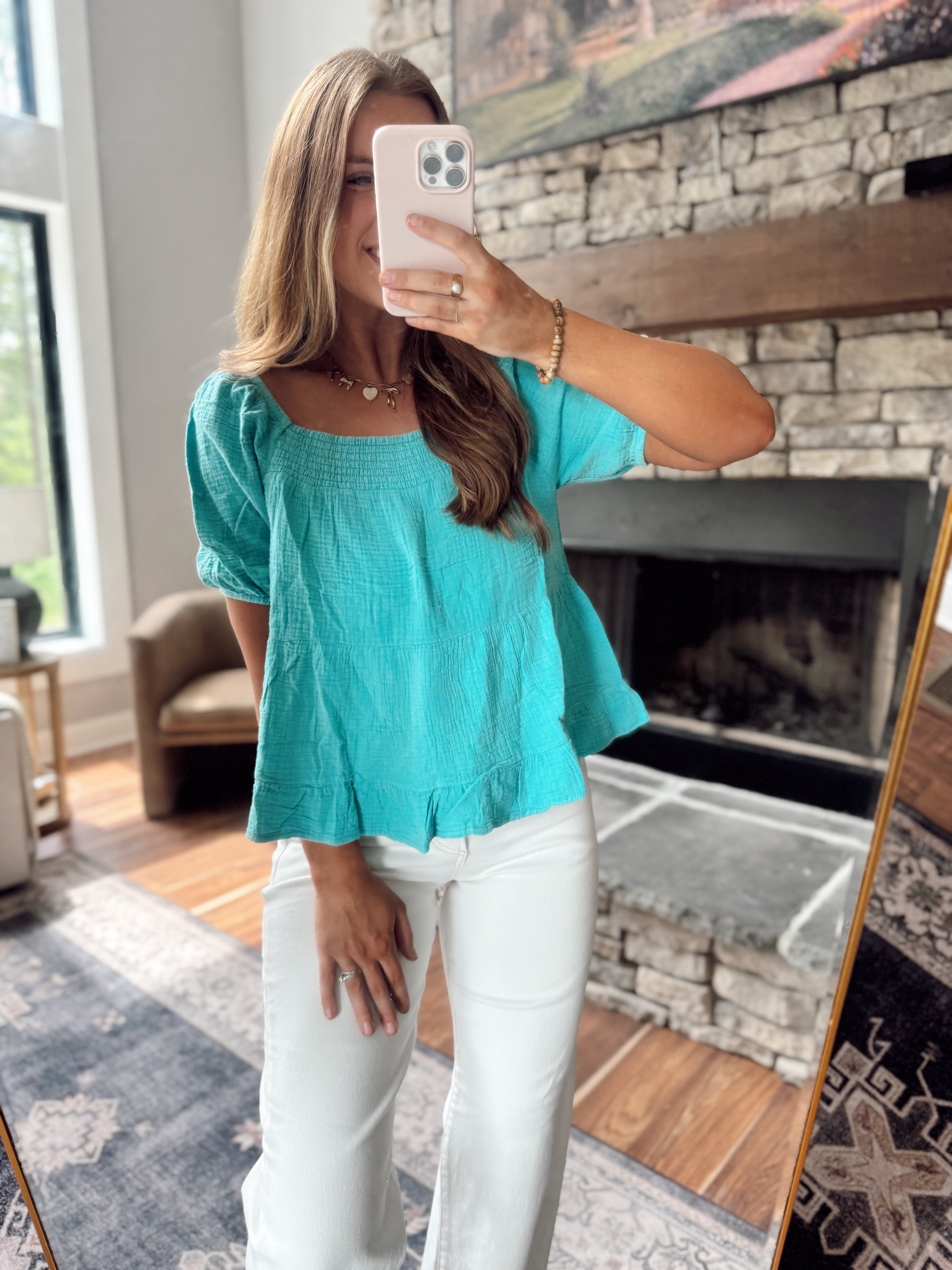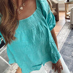 Washed Blue Smocked Puff Sleeve Gauze Top