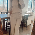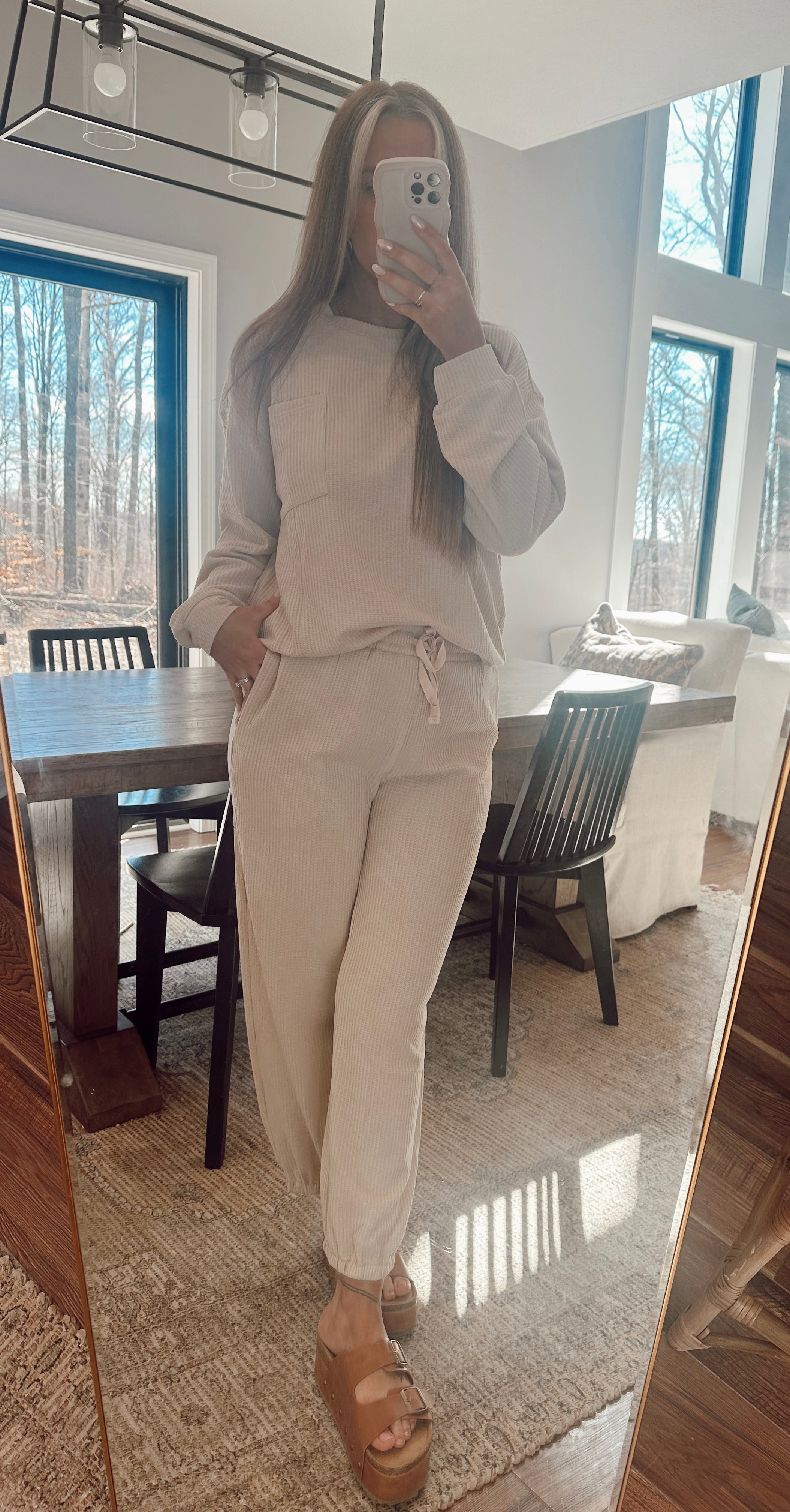 An effortlessly cozy set perfect for lounging, layering, or laid-back days on the go. It's the perfect blend of comfort and style. It's the kind of set that makes you want to curl up with a good book and a warm drink.