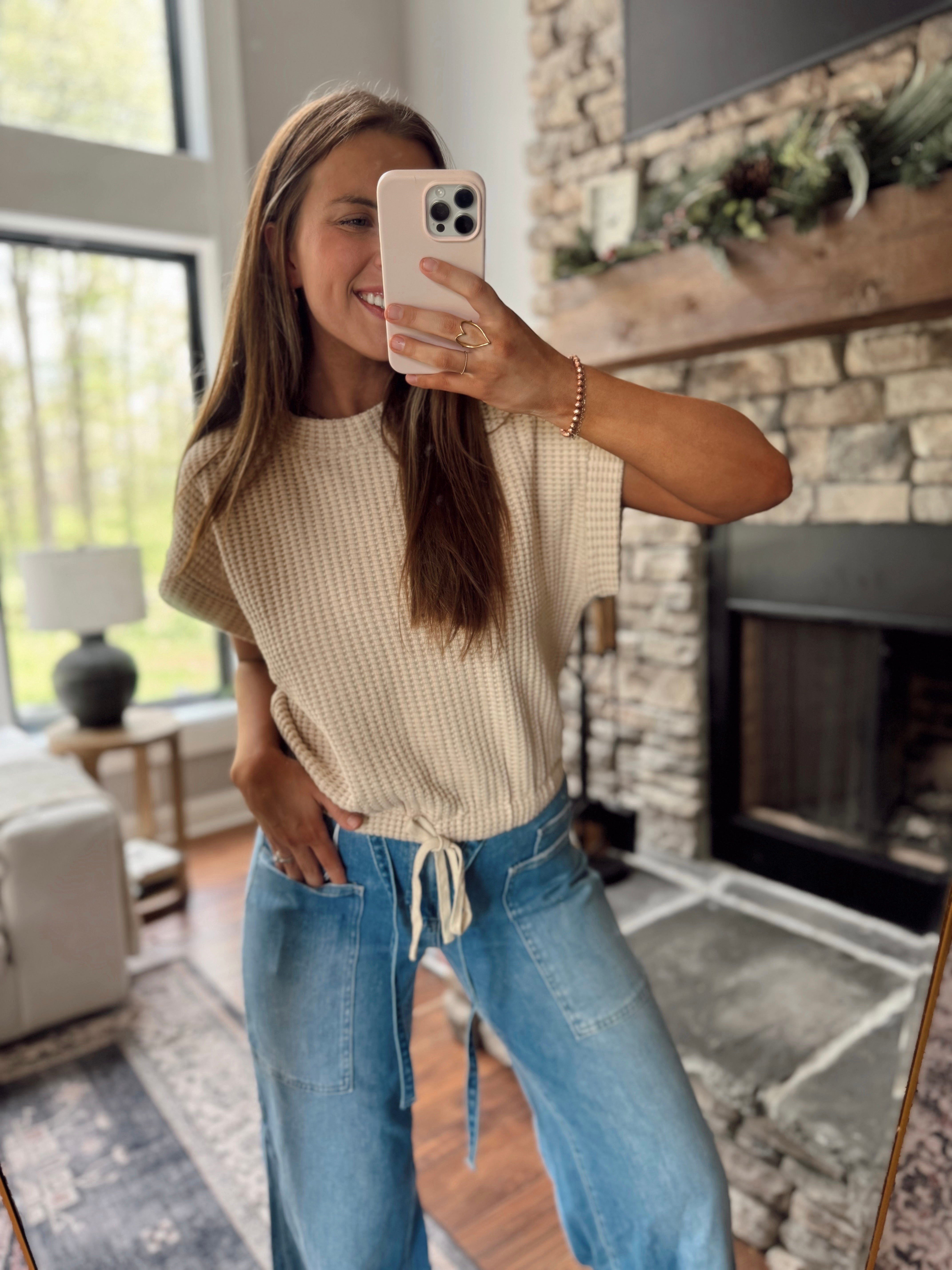 Wheat Waffle Short Sleeve Drawstring Hem Top