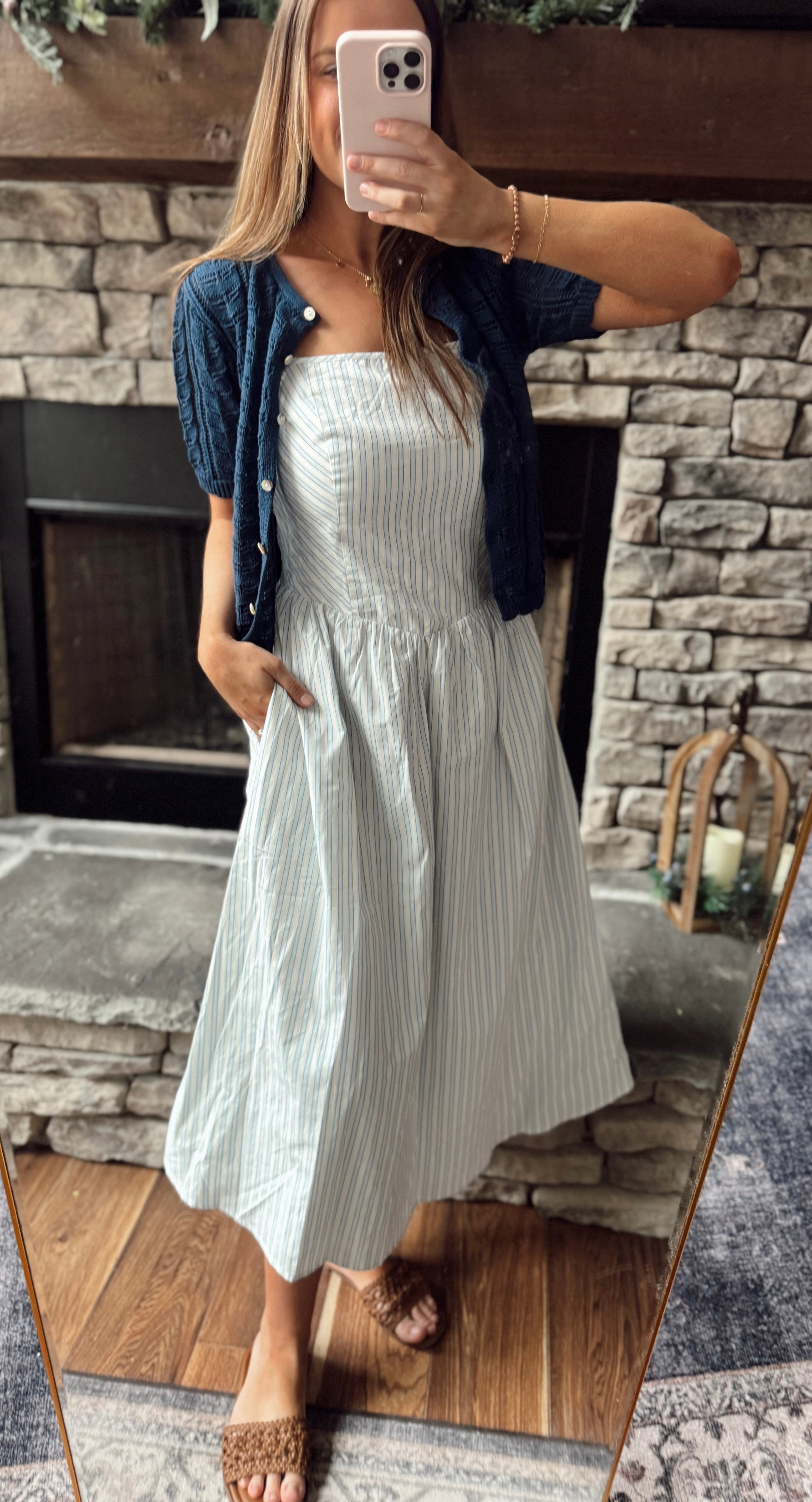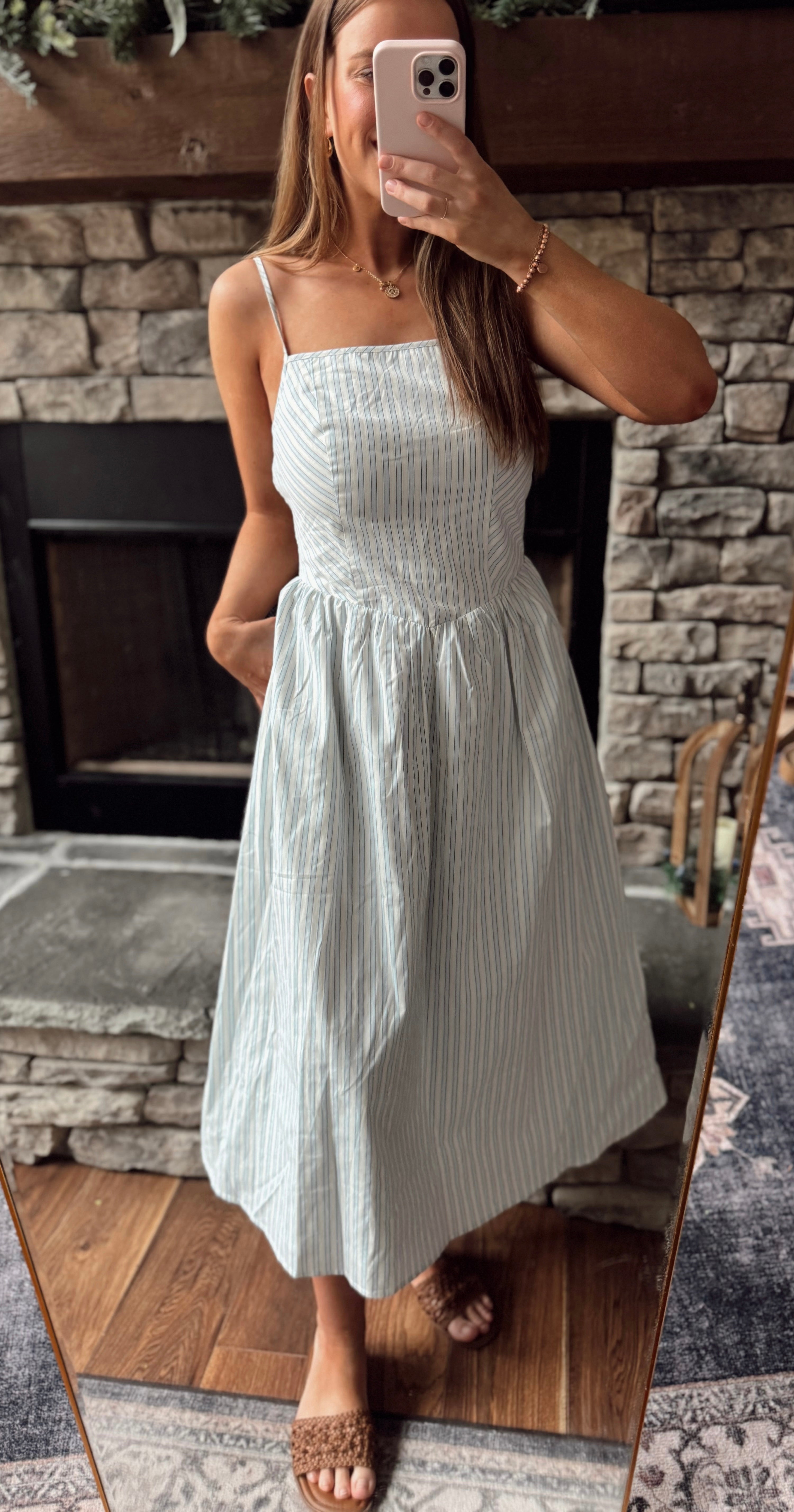 White/Baby Blue Pinstriped Smocked Midi
