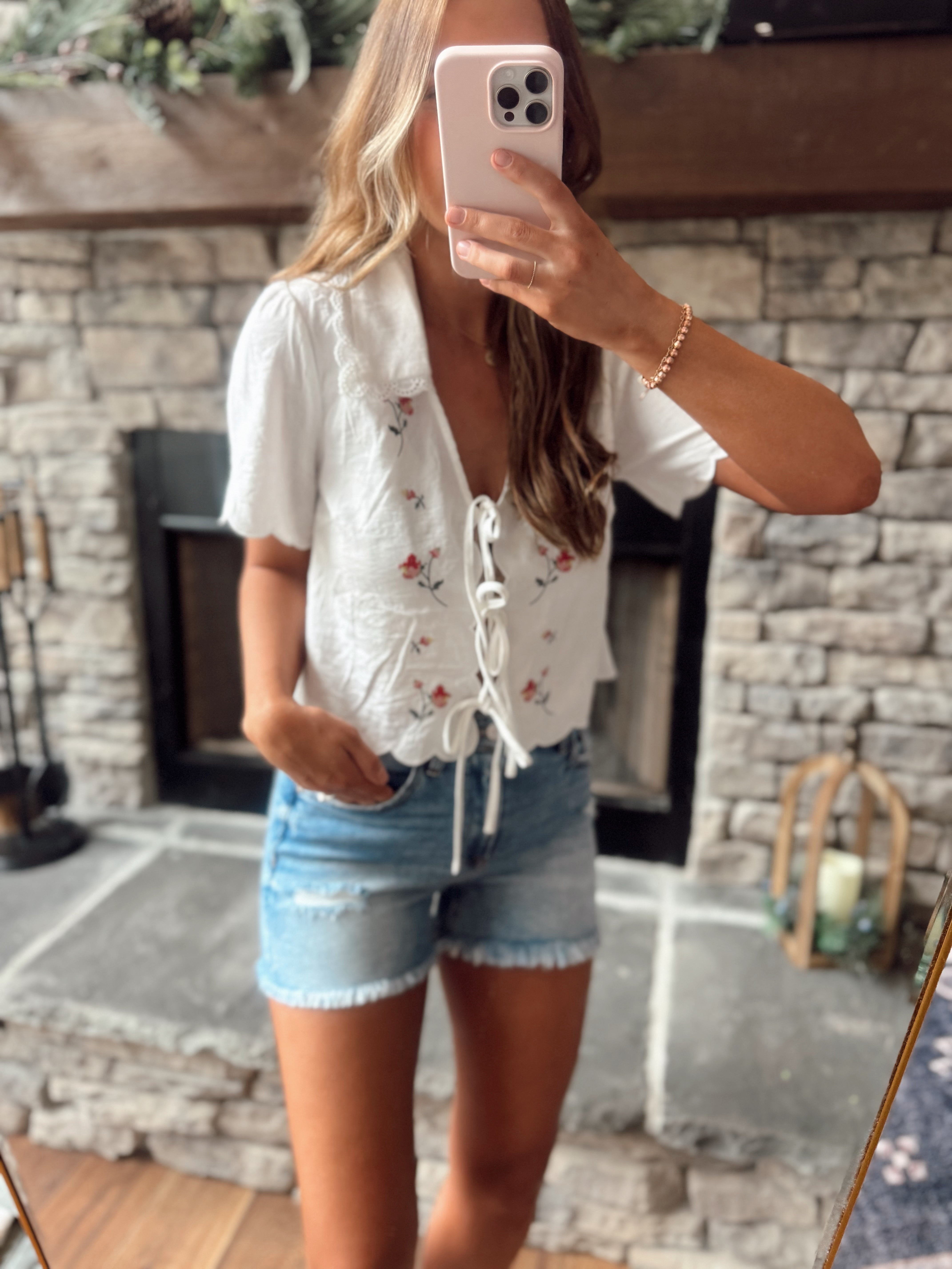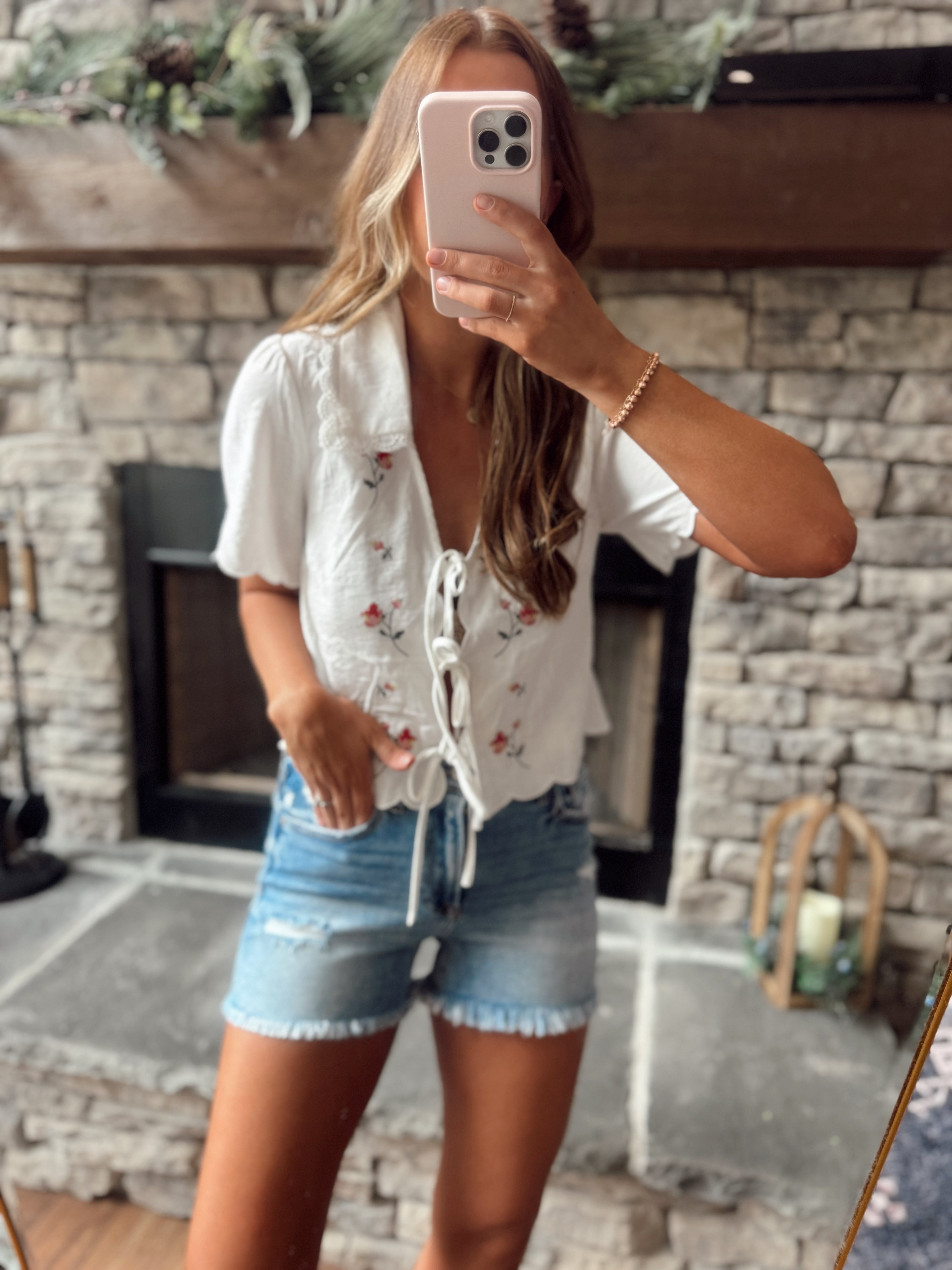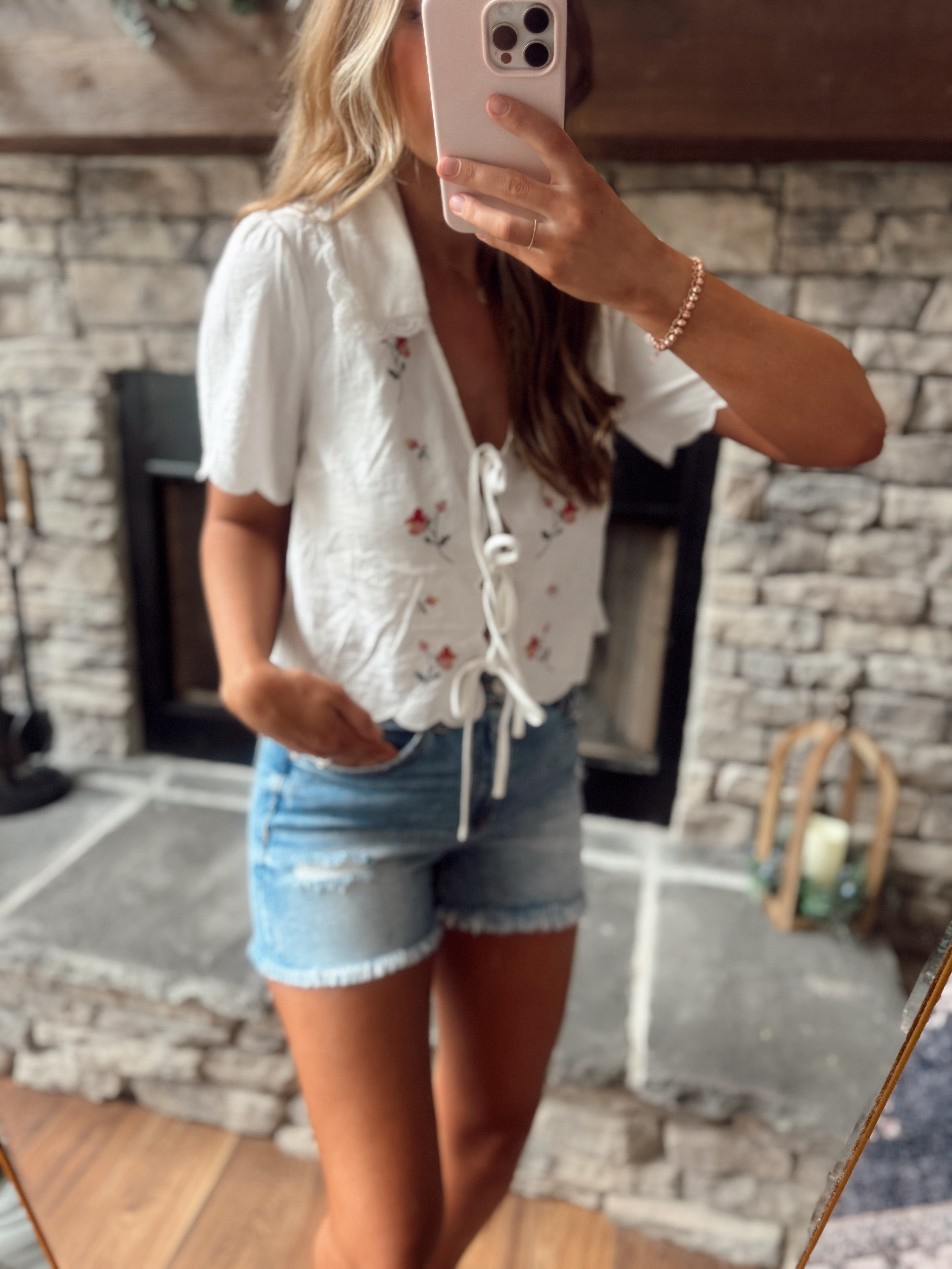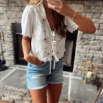 White Collared Embroidered Front Ties Top