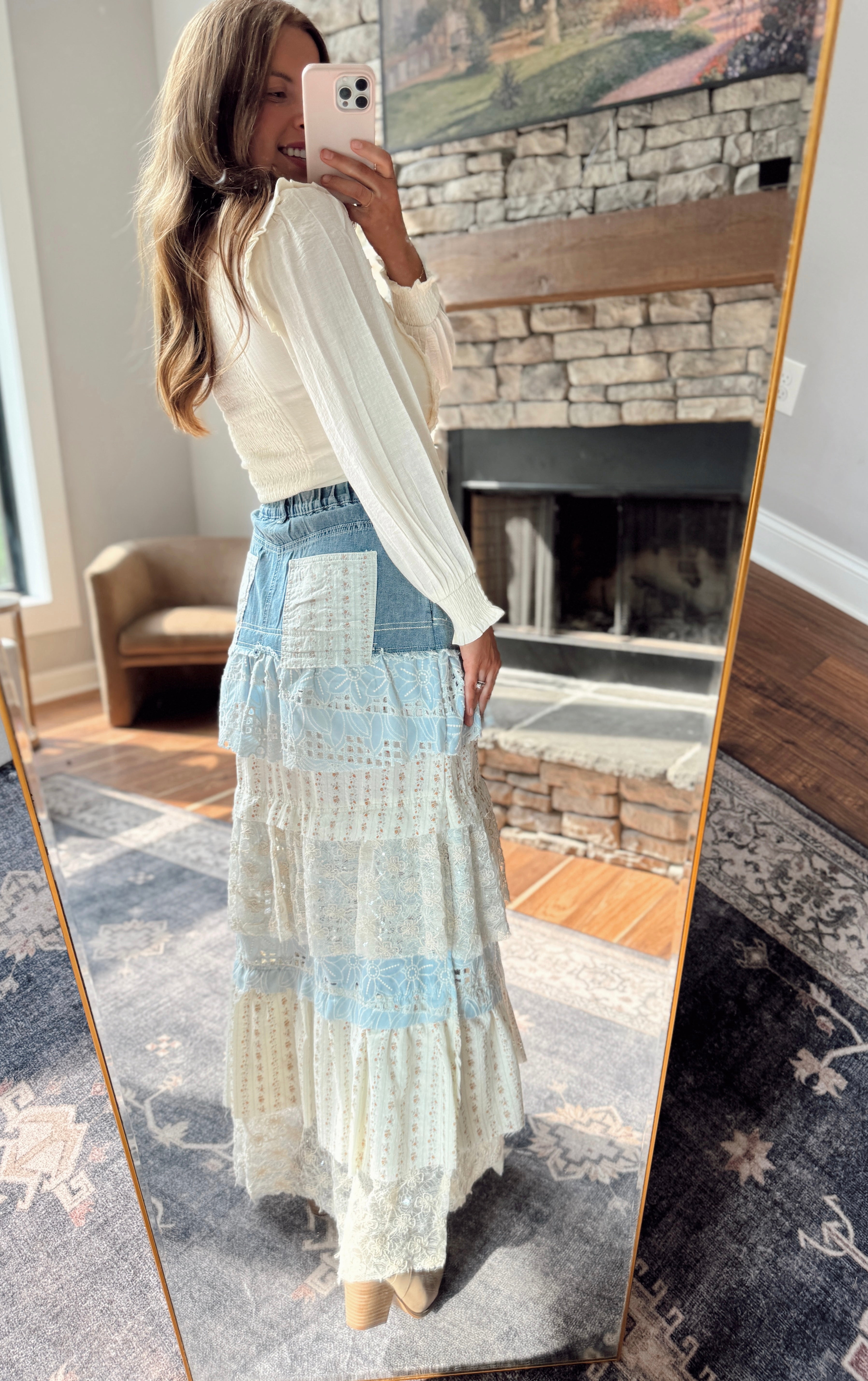 Wildest Dreams Denim Multi Textured Tiered Maxi Skirt