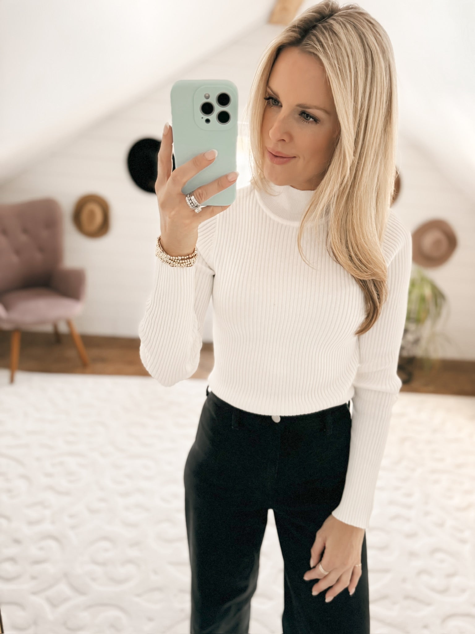 Winnie White Ribbed Knit Mock Neck Long Sleeve